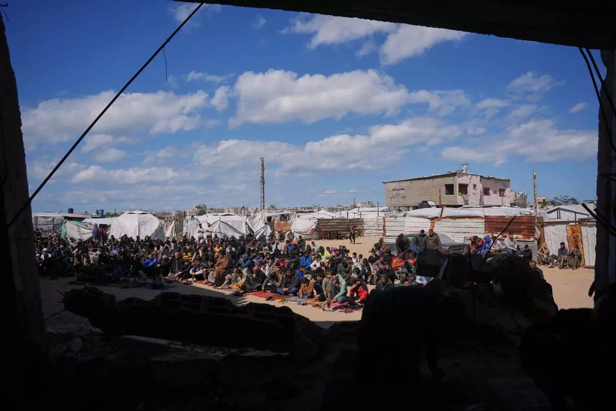 Muslim worshippers take part in the Friday prayers during the holy month of Ramadan outside the destroyed Al-Albani Mosque, in Khan Younis, southern Gaza Strip, Friday, Feb. 27, 2026. (AP Photo/Abdel Kareem Hana)