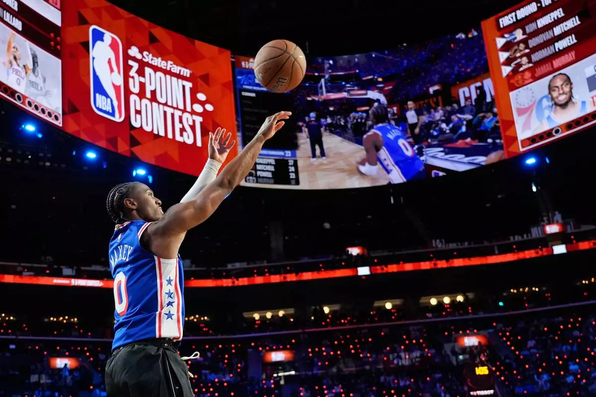 Philadelphia 76ers guard Tyrese Maxey shakes hands with competitors during the 3-point contest at the NBA basketball All-Star weekend festivities Saturday, Feb. 14, 2026, in Inglewood, Calif. (AP Photo/Jae C. Hong)