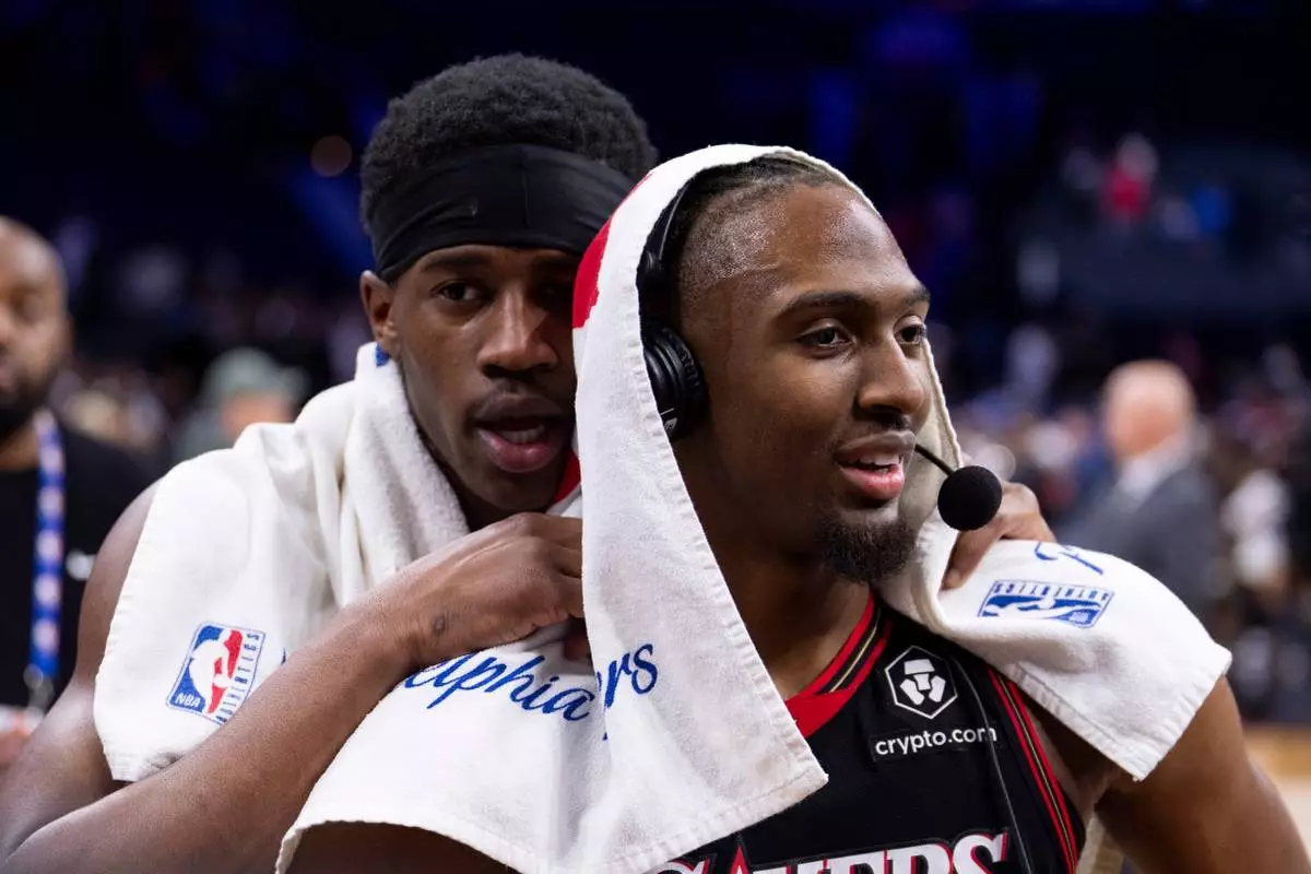 Philadelphia 76ers' Tyrese Maxey, right, is being interviewed as teammate VJ Edgecombe, left, comes up from behind after an NBA basketball game against the Miami Heat, Thursday, Feb. 26, 2026, in Philadelphia. (AP Photo/Chris Szagola)