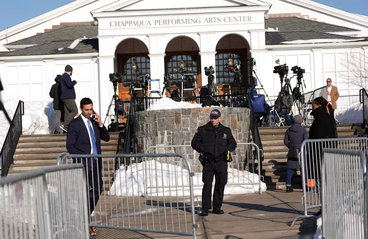 Demonstrators walk around outside the Chappaqua Performing Arts Center while awaiting the arrival of former President Bill Clinton who is testifying before U.S. House lawmakers as part of a congressional investigation into convicted sex offender Jeffrey Epstein, , Friday, Feb. 27, 2026, in Chappaqua, N.Y. (AP Photo/Angelina Katsanis)