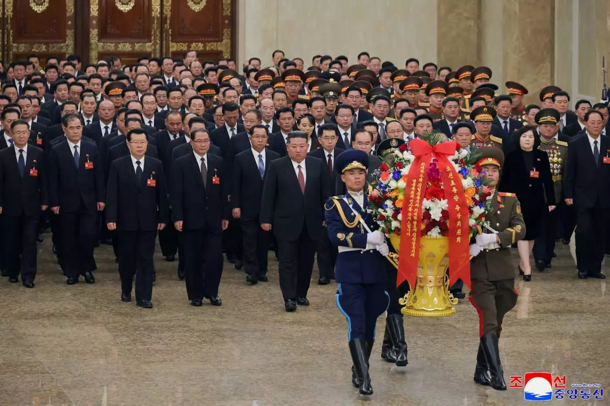 In this photo provided by the North Korean government, its leader Kim Jong Un visits Kumsusan Palace of the Sun with members for the Workers’ Party congress, in Pyongyang, North Korea, Thursday, Feb. 26, 2026. Independent journalists were not given access to cover the event depicted in this image distributed by the North Korean government. The content of this image is as provided and cannot be independently verified. Korean language watermark on image as provided by source reads: "KCNA" which is the abbreviation for Korean Central News Agency. (Korean Central News Agency/Korea News Service via AP)