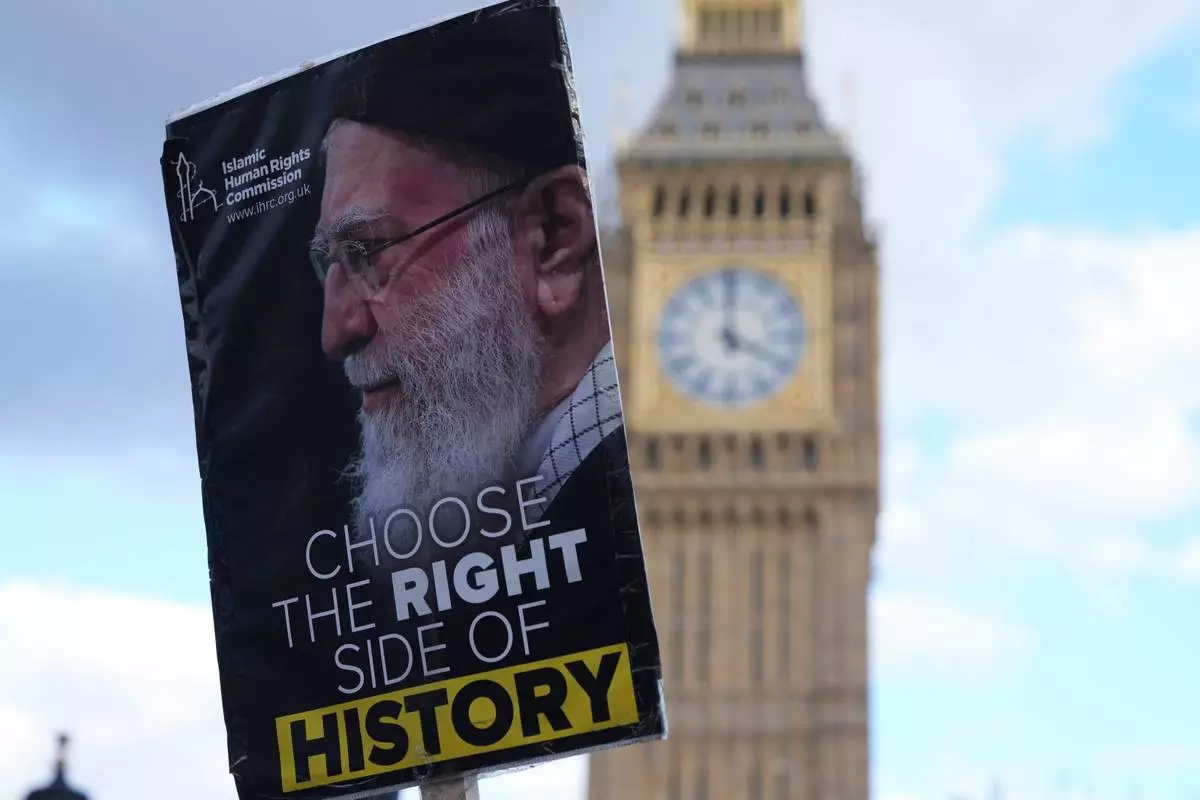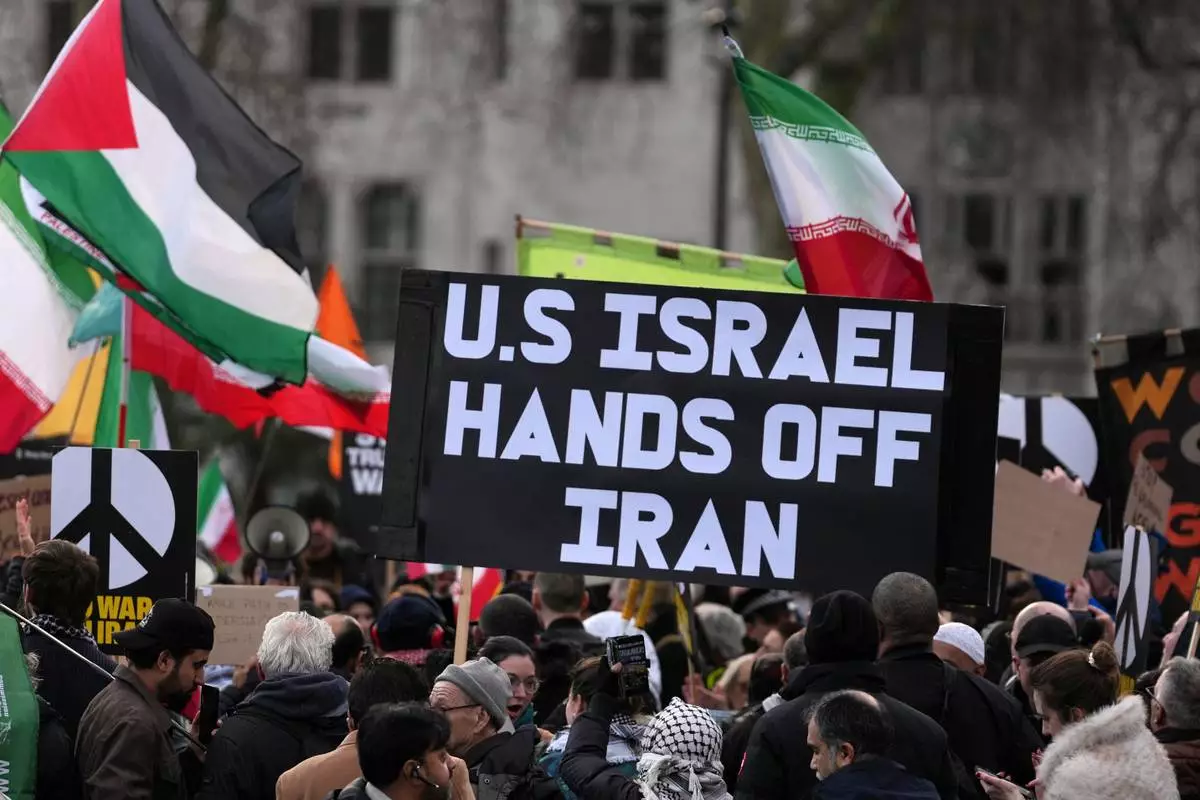 Protesters gather in London, Saturday, Feb. 28, 2026 after U.S. and Israeli forces carried out a series of strikes on Iran on Saturday morning. (AP Photo/Alastair Grant)
