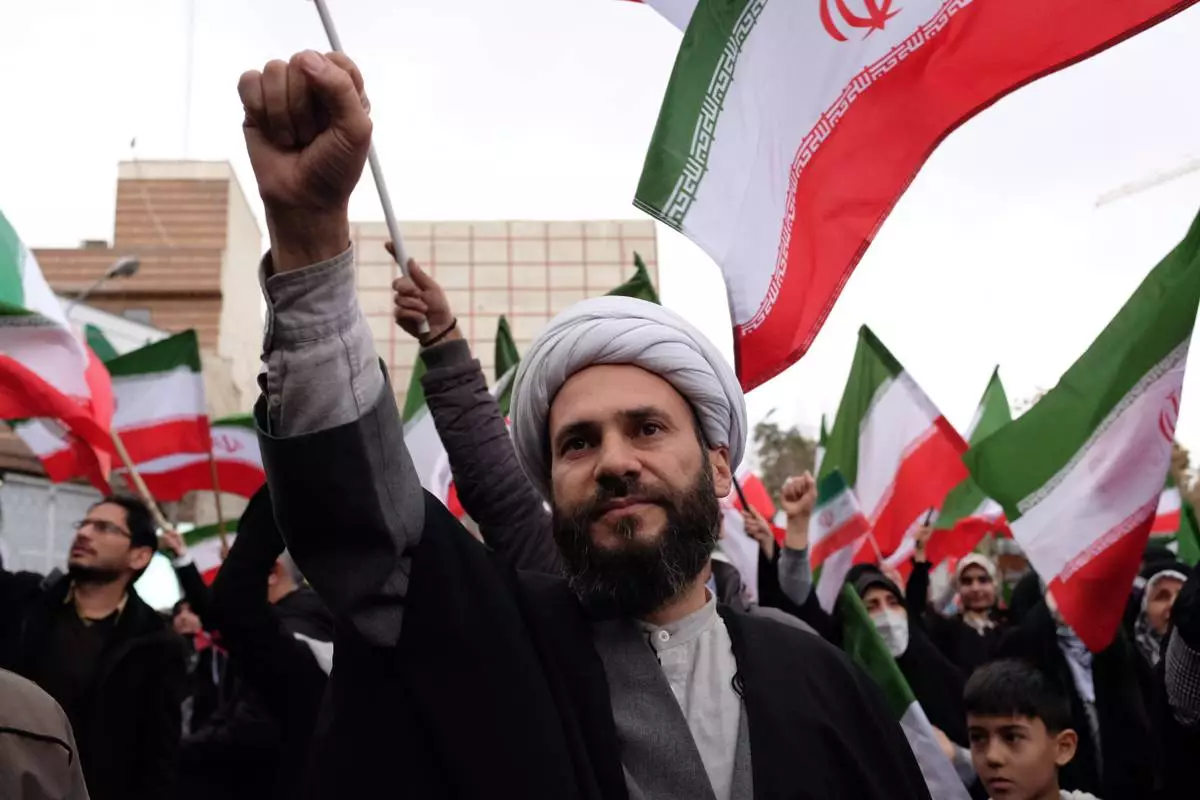 Iranian people attend a demonstration in support of the U.S. and Israeli strikes on Iran in front of Iranian Embassy in Yerevan, Armenia, Saturday, Feb. 28, 2026. (AP Photo/Anthony Pizzoferrato)