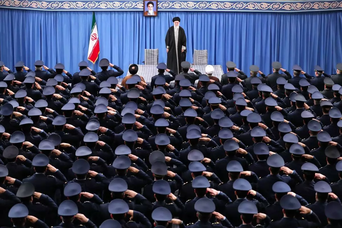 FILE - In this photo released by an official website of the Office of the Iranian Supreme Leader, Supreme Leader Ayatollah Ali Khamenei stands as the army's air force and air defense staff salute in Tehran, Iran, Feb. 8, 2020. A portrait of the late revolutionary founder Ayatollah Khomeini hangs in the background. (Office of the Iranian Supreme Leader via AP, File)