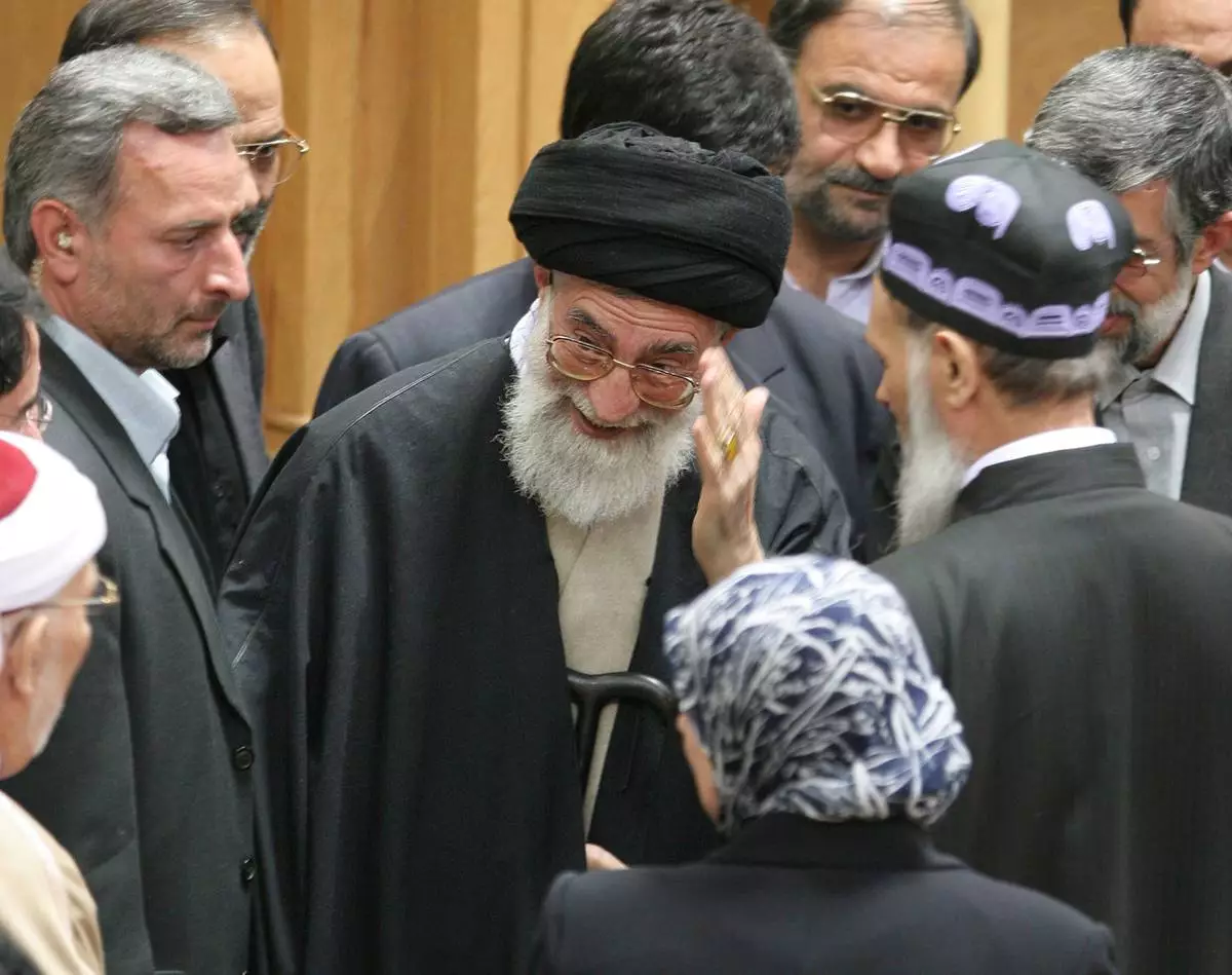 FILE - After delivering his speech, Iran's supreme leader Ayatollah Ali Khamenei waves as he leaves a conference discussing support for the Palestinians in Tehran, Iran, April 14, 2006. (AP Photo/Vahid Salemi, File)