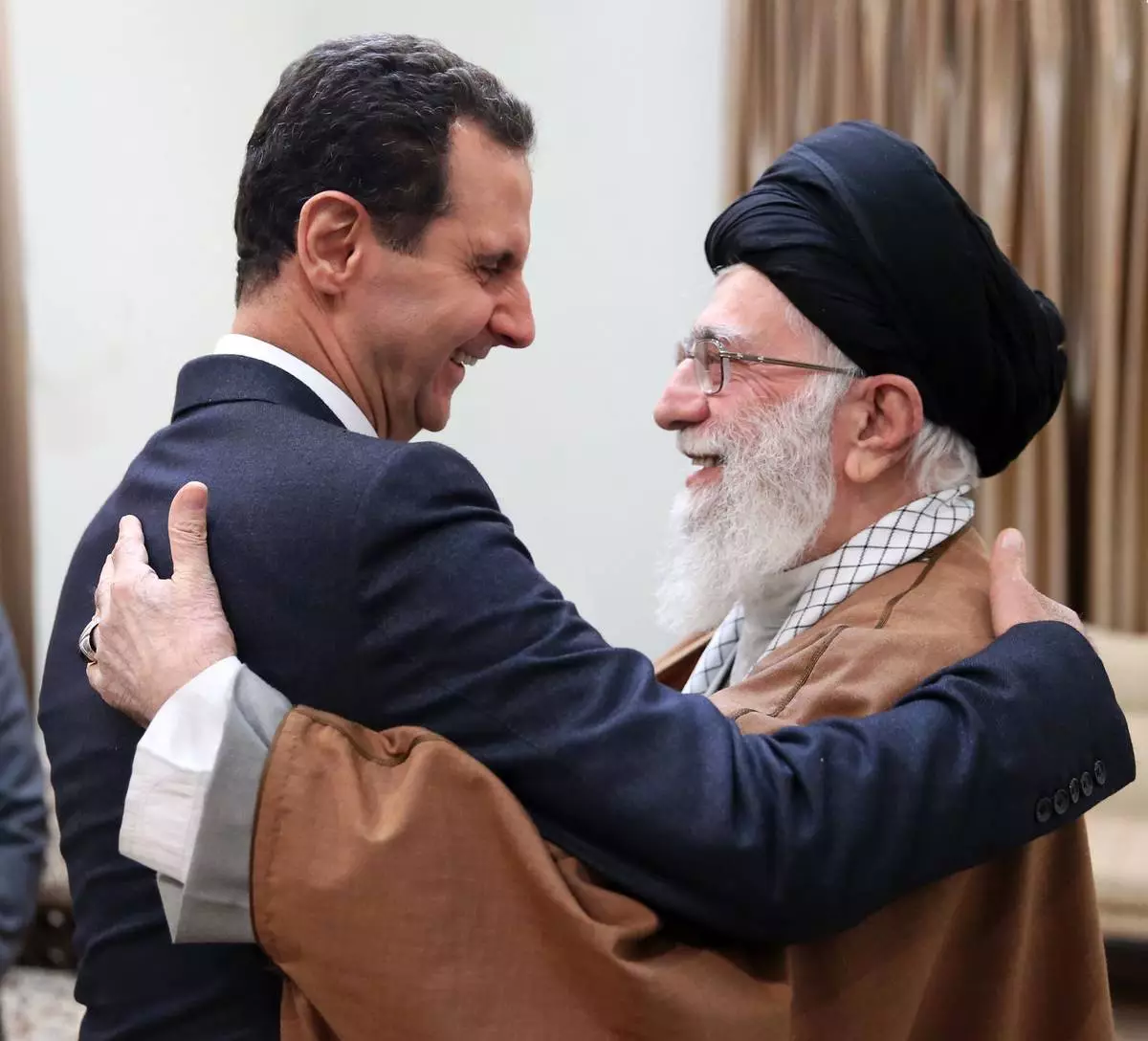 FILE - In this photo released by an official website of the office of the Iranian supreme leader, Supreme Leader Ayatollah Ali Khamenei, right, welcomes Syrian President Bashar Assad for their meeting in Tehran, Iran, Feb. 25, 2019. (Office of the Iranian Supreme Leader via AP, File)