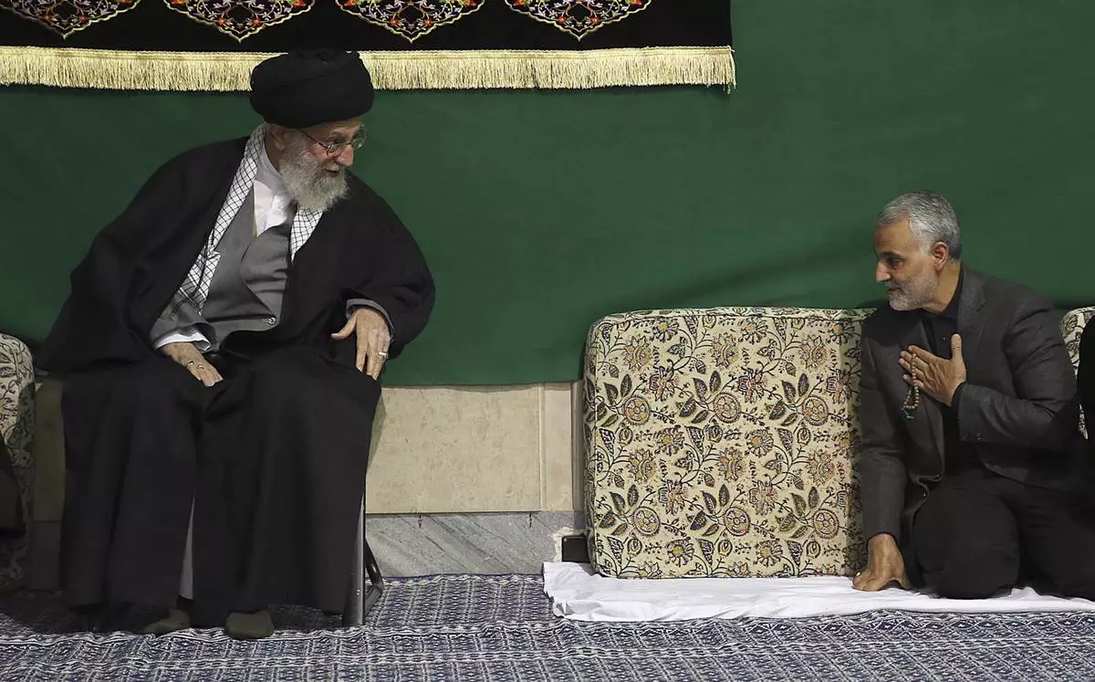 FILE - In this photo released by the official website of the office of the Iranian supreme leader, commander of the Iran's Revolutionary Guard expeditionary Quds Force, Gen. Qassem Soleimani, right, greets Supreme Leader Ayatollah Ali Khamenei while attending a religious ceremony, in Tehran, Iran, March 27, 2015. (Office of the Iranian Supreme Leader via AP, File)
