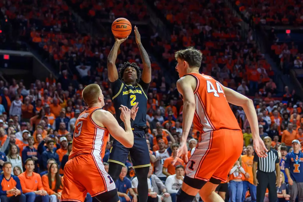 Michigan's L.J. Cason (2) looks to shoot between Illinois' Ben Humrichous, left, and Zvonimir Ivisic, right, during the second half of an NCAA college basketball game Friday, Feb. 27, 2026, in Champaign, Ill. (AP Photo/Craig Pessman)