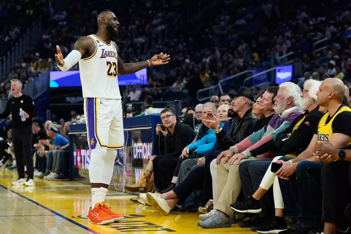 Los Angeles Lakers forward LeBron James (23) talks to fans during the first half of an NBA basketball game against the Golden State Warriors, Saturday, Feb. 28, 2026, in San Francisco. (AP Photo/Godofredo A. Vásquez)