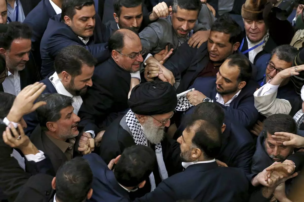 FILE - Iran's supreme leader Ayatollah Ali Khamenei, center, leaves an event titled "International Conference in Support of Palestinian Intifada," in Tehran, Iran, Feb. 21, 2017. (AP Photo/Ebrahim Noroozi, File)