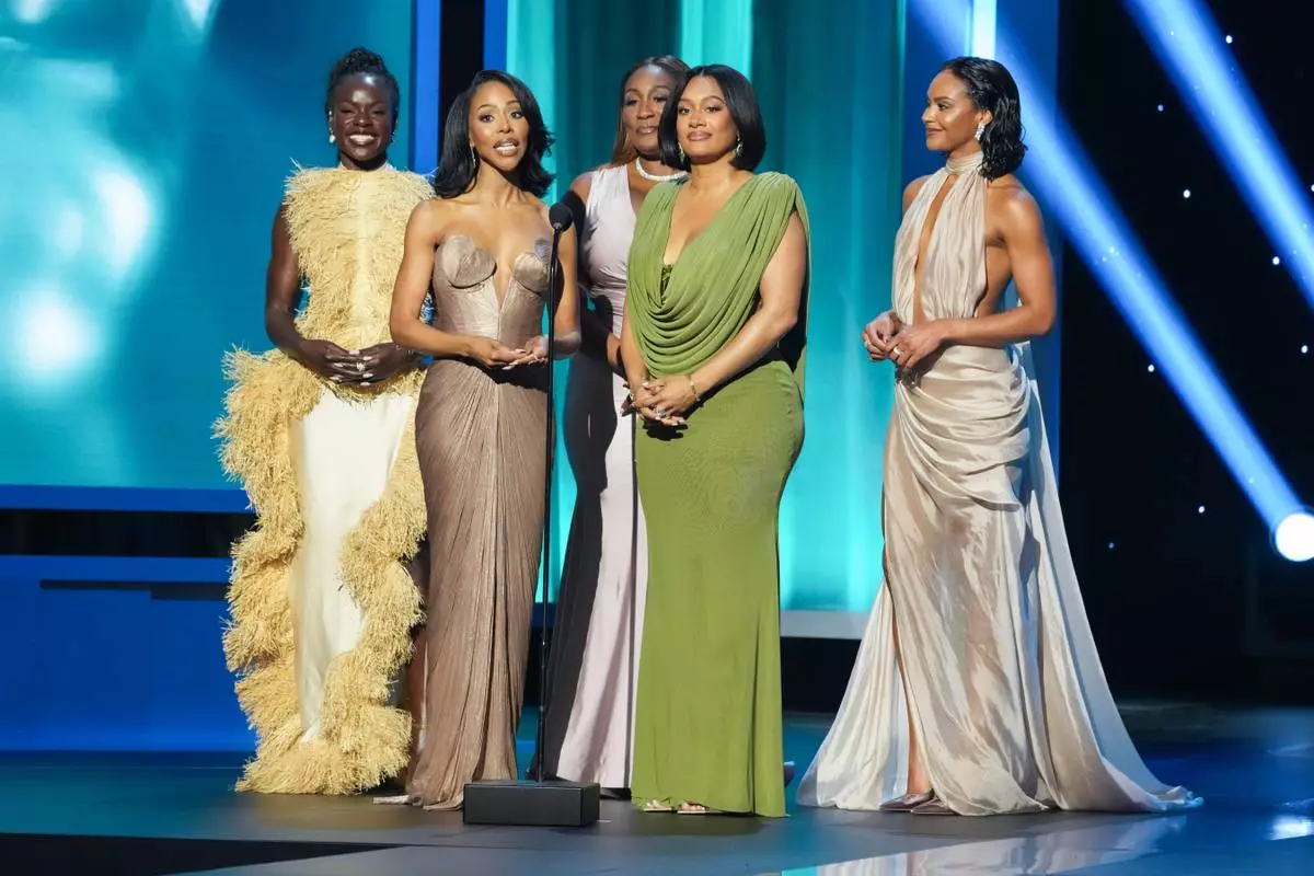 Tunde Oyeneyin, from left, KJ Smith Black, Mignon, Crystal Renee Hayslett and Jordan Coleman present the award for outstanding actress in a comedy series during the 57th NAACP Image Awards on Saturday, Feb. 28, 2026, in Pasadena, Calif. (AP Photo/Chris Pizzello)