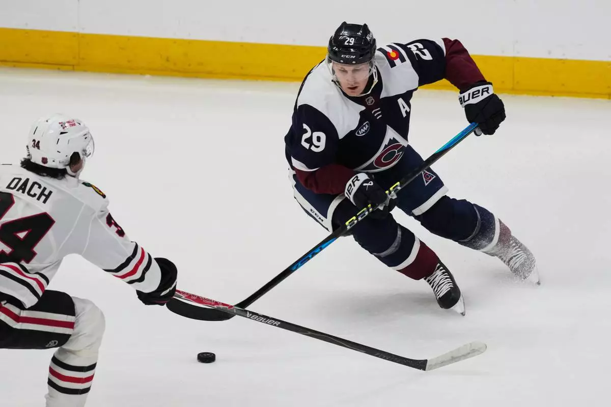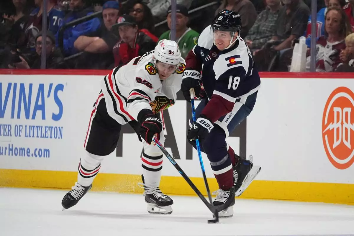 Colorado Avalanche center Nathan MacKinnon, right, looks to pass the puck as Chicago Blackhawks center Colton Dach defends in the first period of an NHL hockey game Saturday, Feb. 28, 2026, in Denver. (AP Photo/David Zalubowski)