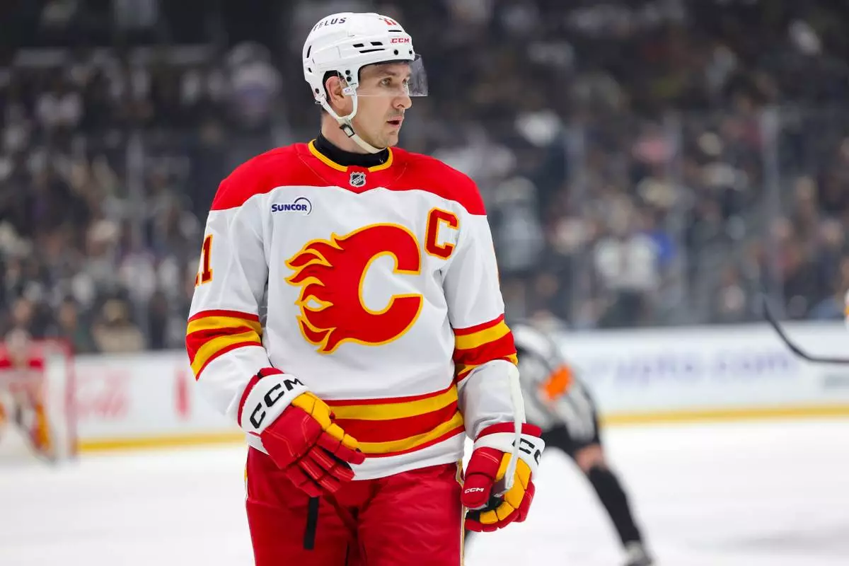 Calgary Flames center Mikael Backlund stands during a face off during the first period of an NHL hockey game against the Los Angeles Kings Saturday, Feb. 28, 2026 in Los Angeles. (AP Photo/Ryan Sun)