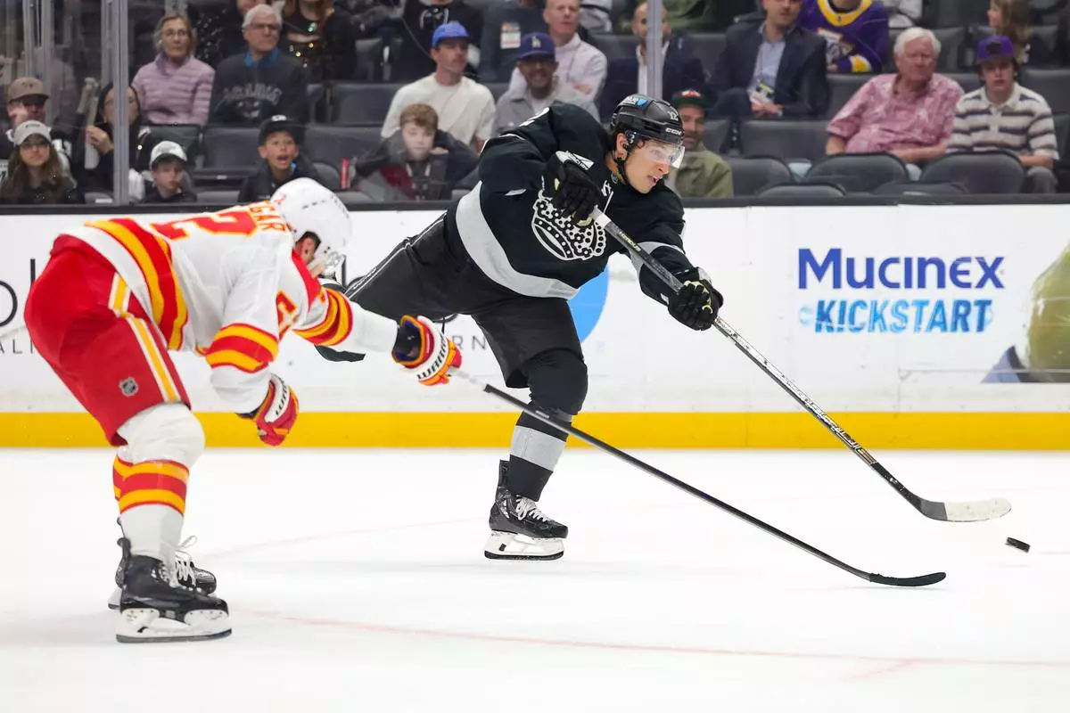 Los Angeles Kings left wing Trevor Moore, right, shoots against Calgary Flames defenseman MacKenzie Weegar during the second period of an NHL hockey game Saturday, Feb. 28, 2026 in Los Angeles. (AP Photo/Ryan Sun)