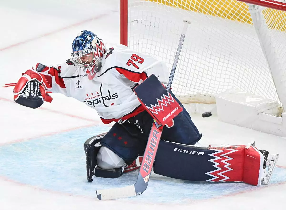 Washington Capitals goaltender Charlie Lindgren (79) is scored on by Montreal Canadiens' Kirby Dach, not pictured, during the second period of an NHL hockey game in Montreal, Saturday, Feb. 28, 2026. (Graham Hughes/The Canadian Press via AP)