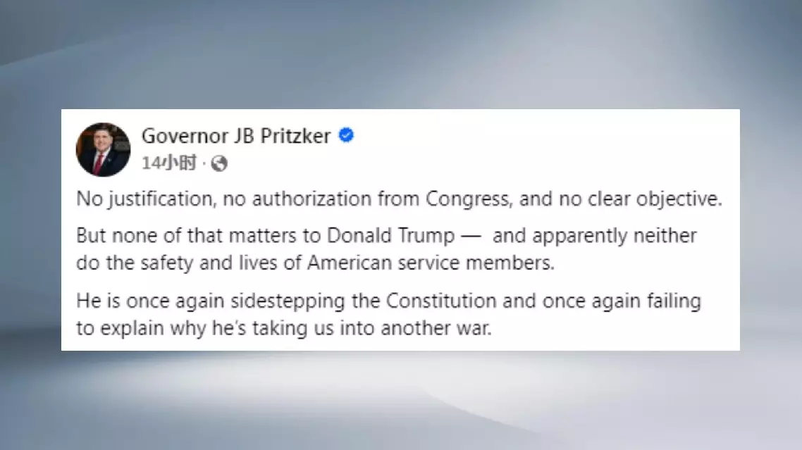 In his statement on social media, Illinois Democratic Governor Jay Robert Pritzker called the military action unjustified, unauthorized by Congress, and without a clear objective.
