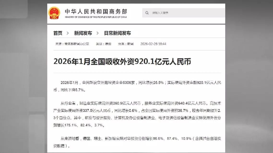 "In January this year, China's efforts to attract and utilize foreign investment demonstrated a new momentum. The investment structure continued to improve, with the share of the actual amount of foreign investment used by the high-tech industry rising by 2.3 percentage points compared with the same period last year. Foreign enterprises have become more confident in investing in China. Since the beginning of the year, executives of foreign companies have visited China frequently, and investment from countries including Germany in China has grown substantially," said Yuan Qian, researcher at the Institute of Foreign Economic Research.