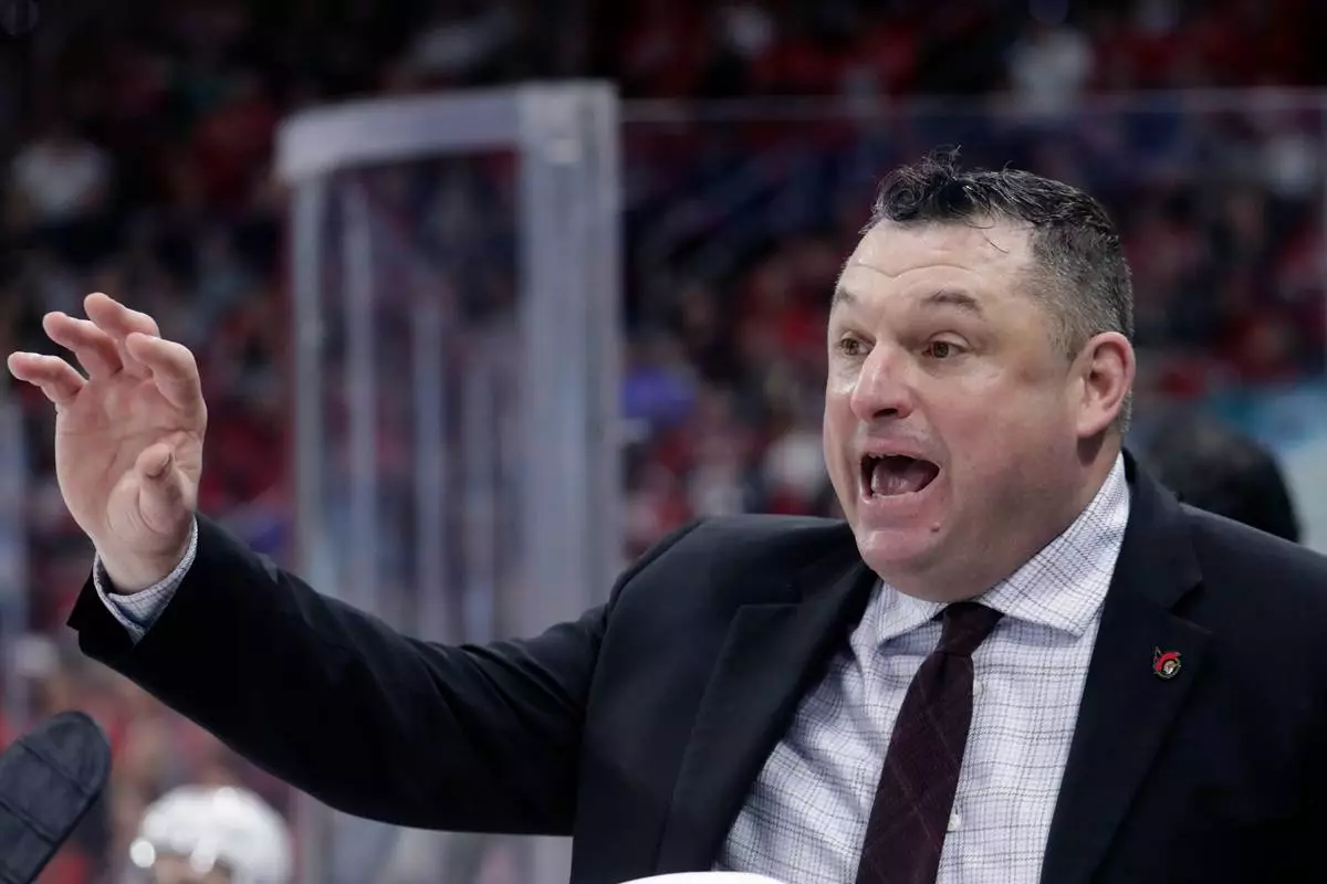 FILE - Ottawa Senators head coach D.J. Smith directs the team during the first period of an NHL hockey game against the Carolina Hurricanes, April 4, 2023, in Raleigh, N.C. (AP Photo/Chris Seward, File)