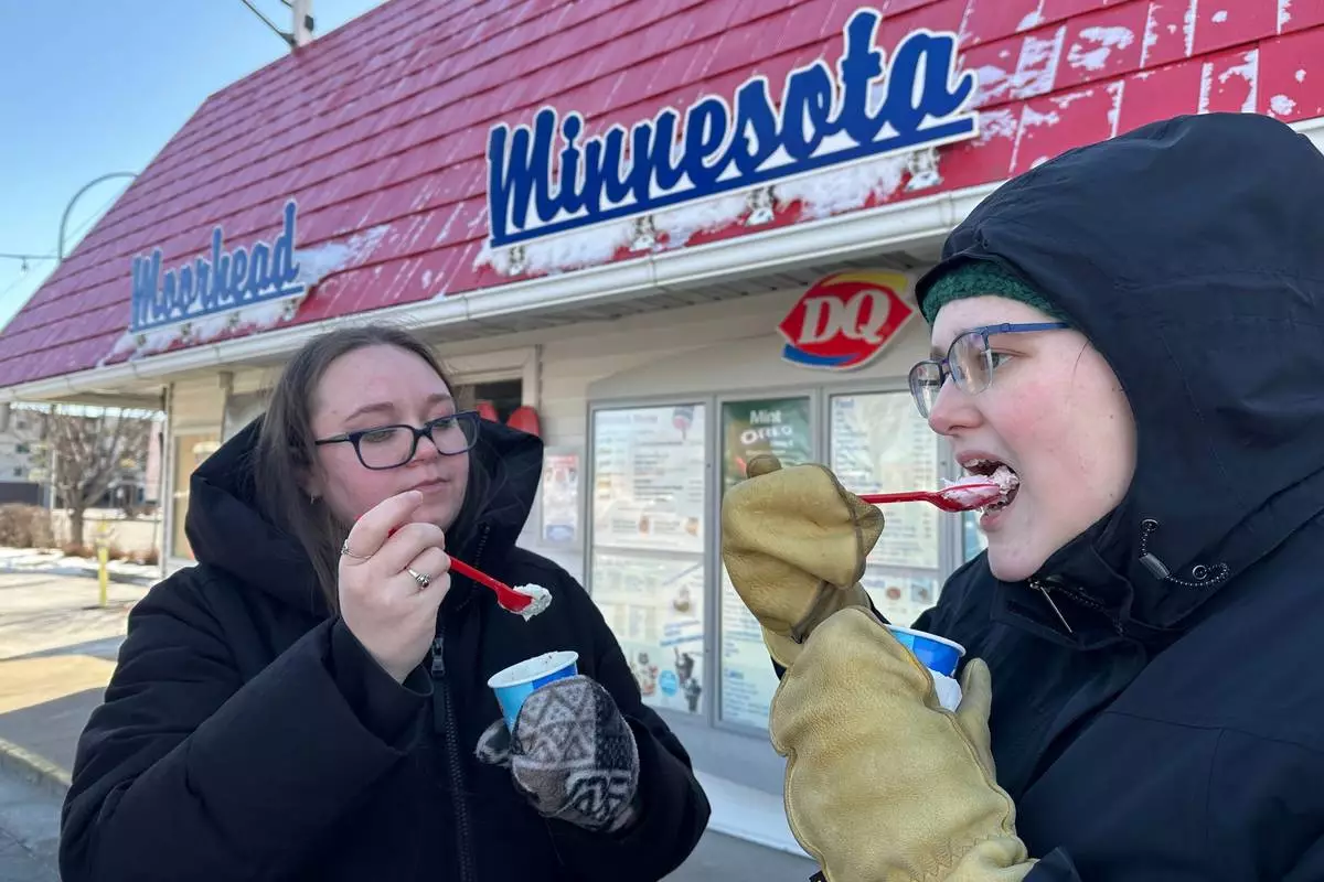 Koral Salisbury, left, and Ally Hoekstra eat ice cream treats Sunday, March 1, 2026, at the Dairy Queen in Moorhead, Minn. (AP Photo/Jack Dura)