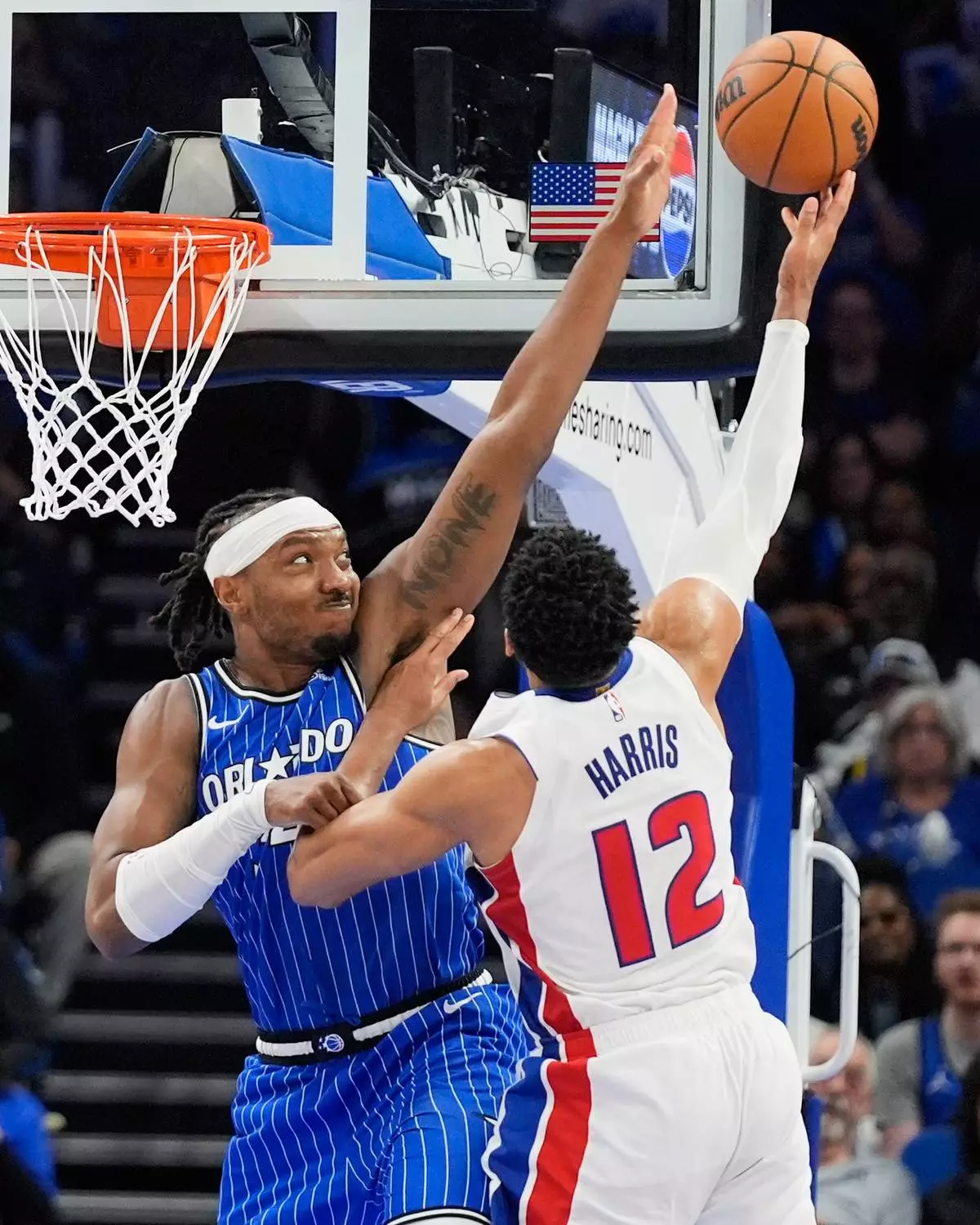 Orlando Magic center Wendell Carter Jr., left, tries to block a shot by Detroit Pistons forward Tobias Harris (12) during the second half of an NBA basketball game, Sunday, March 1, 2026, in Orlando, Fla. (AP Photo/John Raoux)