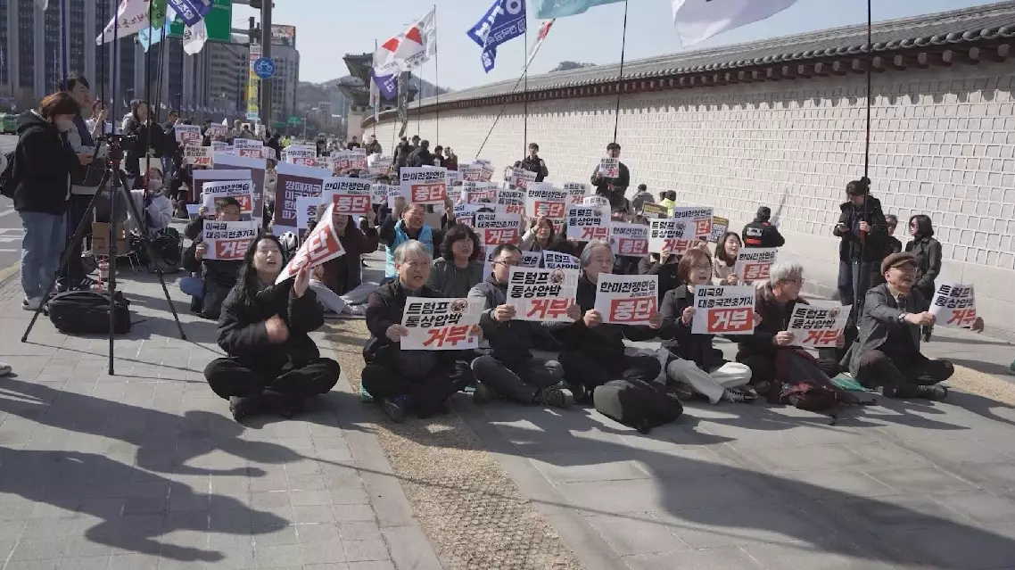 "South Korea and the United States signed the ROK-U.S. Free Trade Agreement. But without upholding the terms of that agreement, they are unilaterally raising tariffs. The principle is supposed to be reciprocal. So, if the U.S. raises tariffs, the ROK should respond by raising tariffs as well. I think it's unfair because it's so unilateral," said Ahn Ji-jung, a member of Joint Action to Stop Trump.