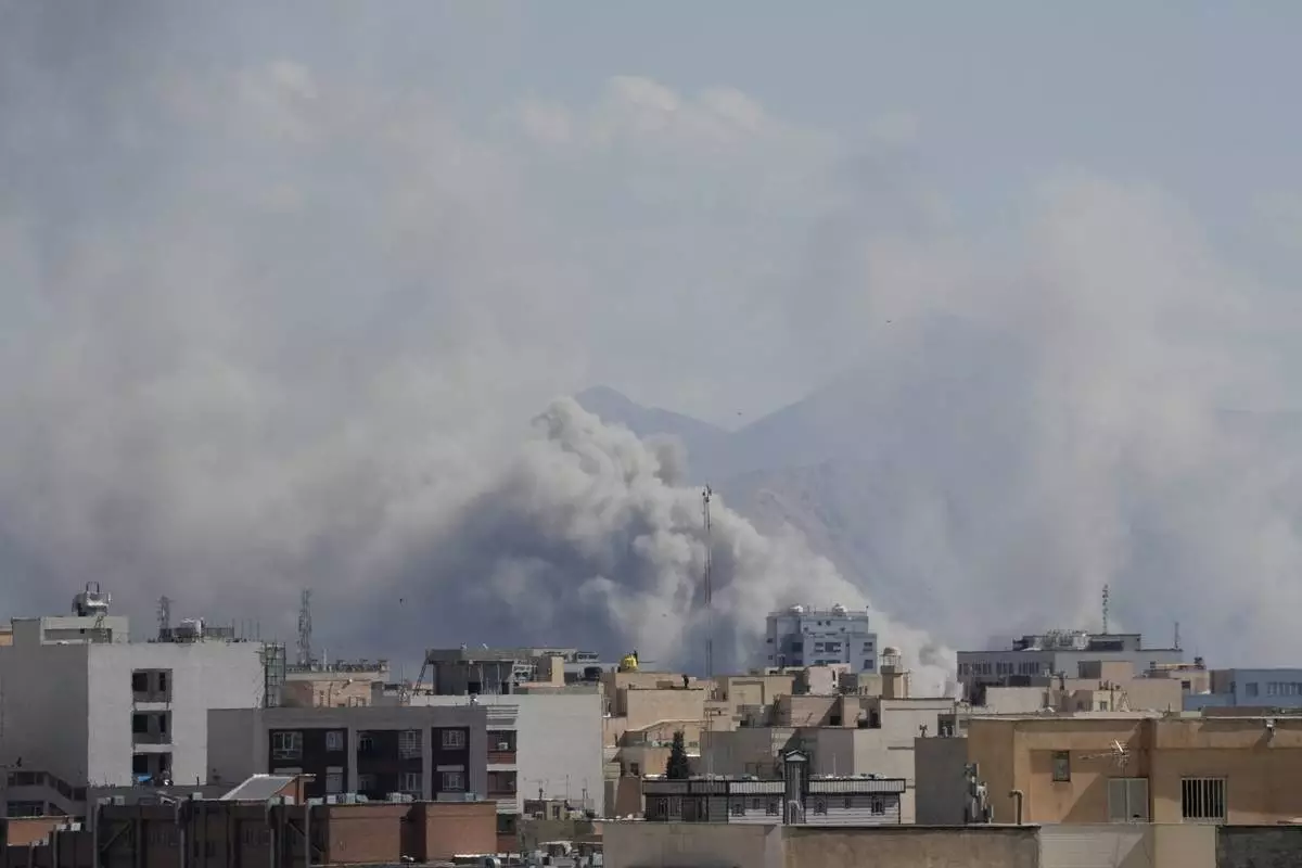 Smoke rises up after a strike in Tehran, Iran, Sunday, March 1, 2026. (AP Photo/Vahid Salemi)