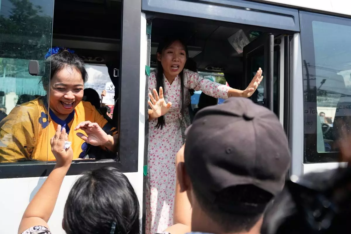 Released prisoners, in a bus, is welcomed by family members and colleagues after they left Insein Prison Monday, March 2, 2026, in Yangon, Myanmar. (AP Photo/Thein Zaw)