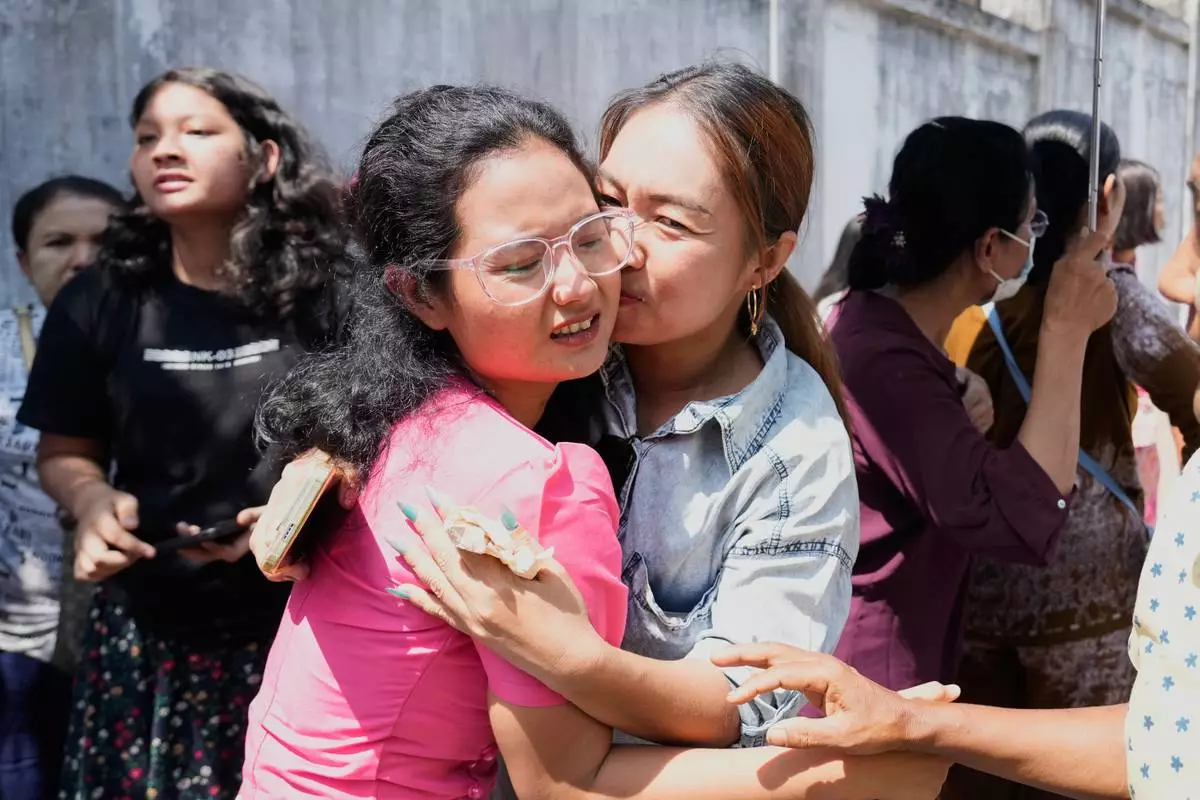 A released prisoner, front left, is welcomed by her colleagues after she was released from Insein Prison Monday, March 2, 2026, in Yangon, Myanmar. (AP Photo/Thein Zaw)