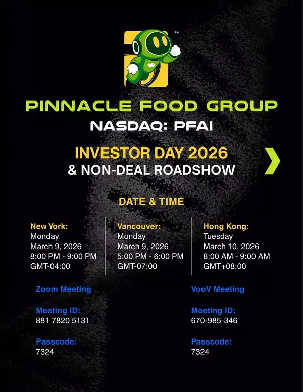 VANCOUVER, BC, March 2, 2026 /PRNewswire/ -- Pinnacle Food Group Limited (Nasdaq: PFAI), a technology-driven smart farming and bio-engineering company, providing integrated farming-as-a-service solutions and developing biology-enabled platforms to support efficient and sustainable food systems, today announced that it will host its virtual "Investor Day 2026 & Non-Deal Roadshow" on Monday, March 9, 2026 (U.S. Time) / Tuesday, March 10, 2026 (Asia Time).