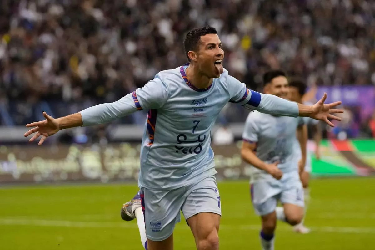 FILE - Al Nassr's Cristiano Ronaldo celebrates after scoring at the King Saud University Stadium, in Riyadh, Saudi Arabia, Jan. 19, 2023. (AP Photo/Hussein Malla, file)
