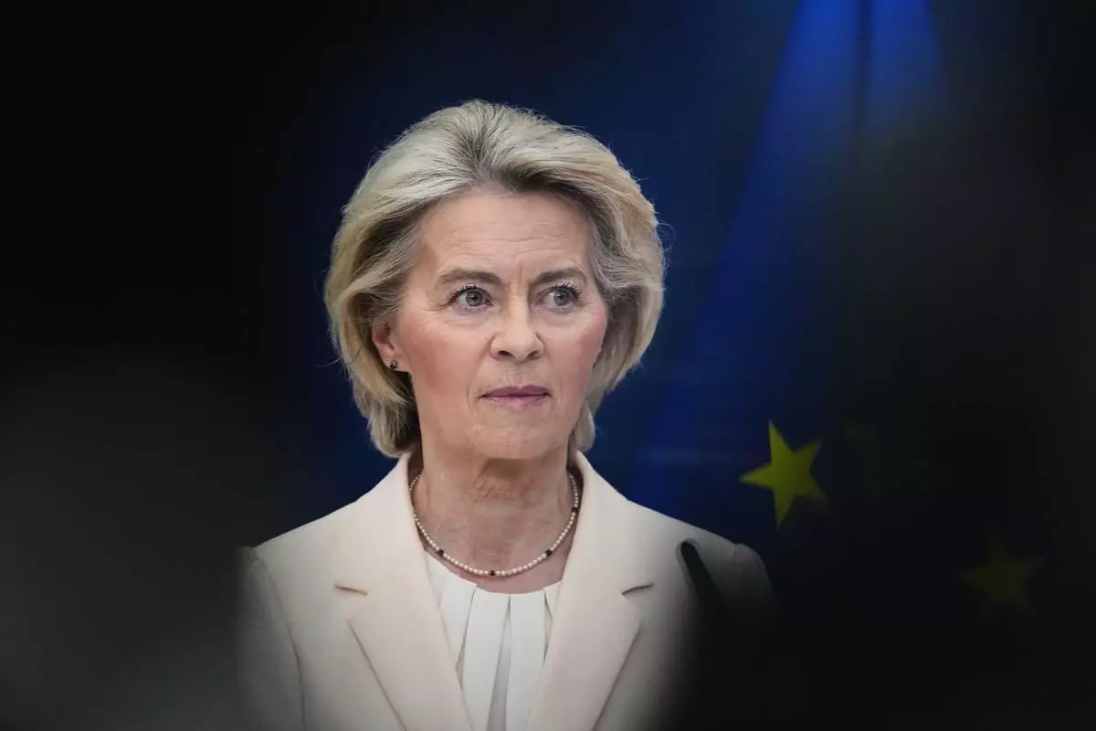 European Commission President Ursula von der Leyen speaks during a media conference at EU headquarters in Brussels, Belgium, Monday, March 2, 2026. (AP Photo/Virginia Mayo)