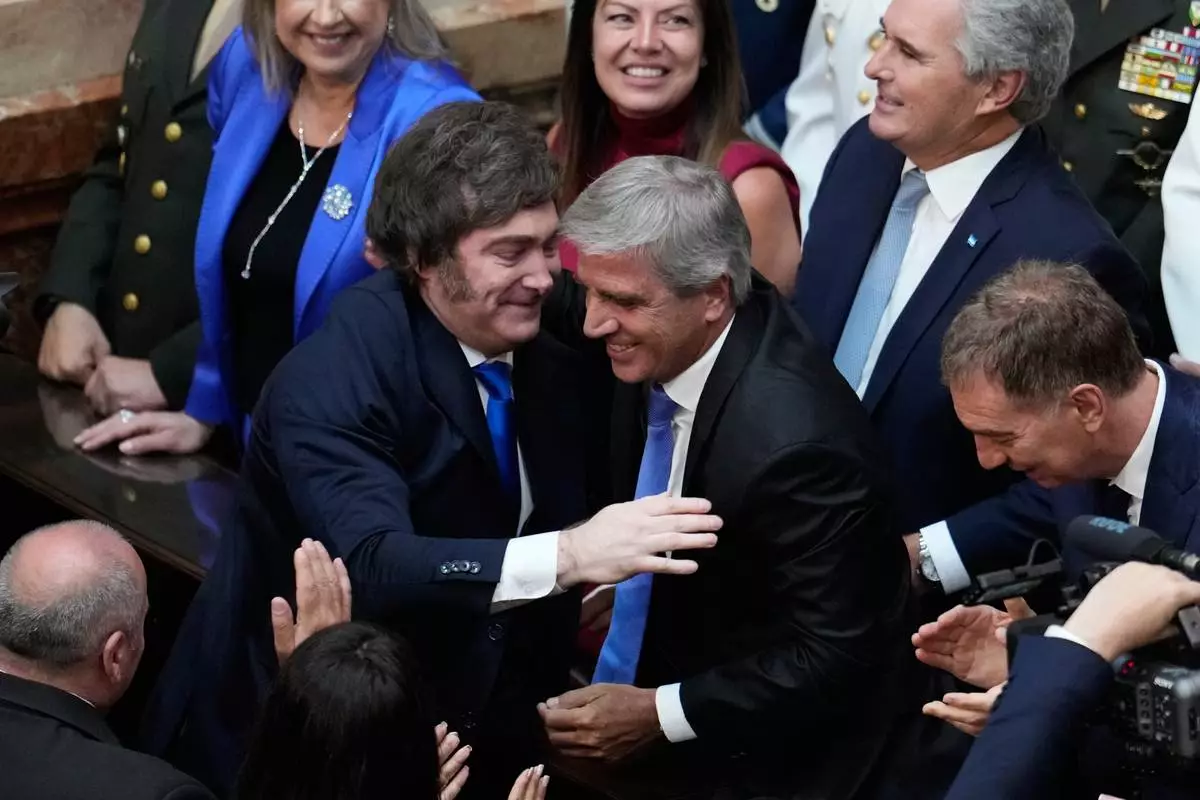 Argentina's President Javier Milei, left, greets Economy Minister Luis Caputo before delivering the annual State of the Nation address at Congress in Buenos Aires, Argentina, Sunday, March 1, 2026. (AP Photo/Gustavo Garello)