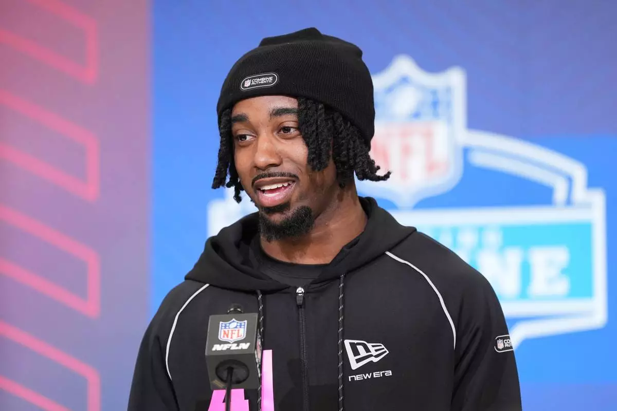 Indiana defensive back Louis Moore answers questions during a press conference at the NFL football scouting combine in Indianapolis, Thursday, Feb. 26, 2026. (AP Photo/Eric Gay)