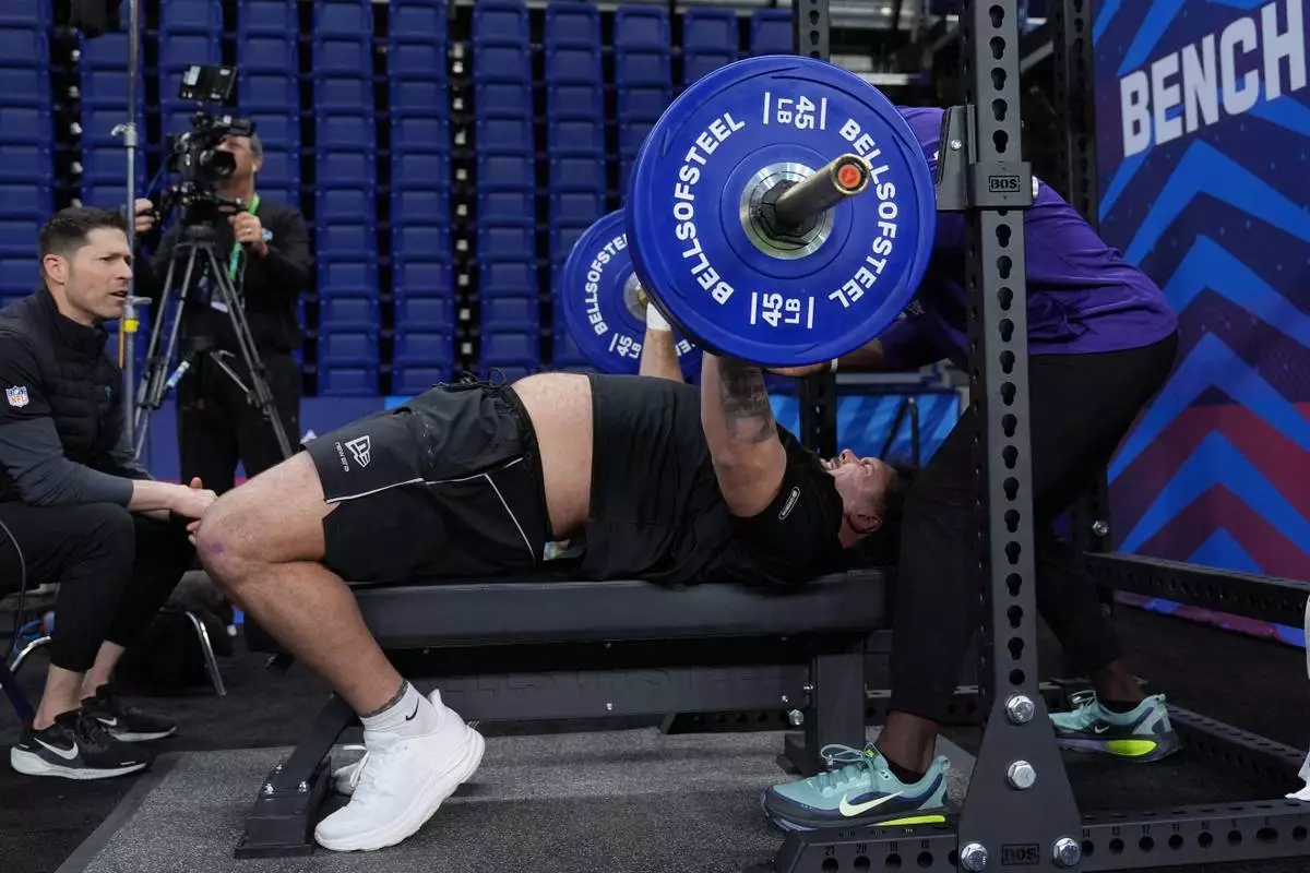 Arkansas offensive lineman Fernando Carmona lifts weights at the NFL football scouting combine in Indianapolis, Monday, March 2, 2026. (AP Photo/Eric Gay)