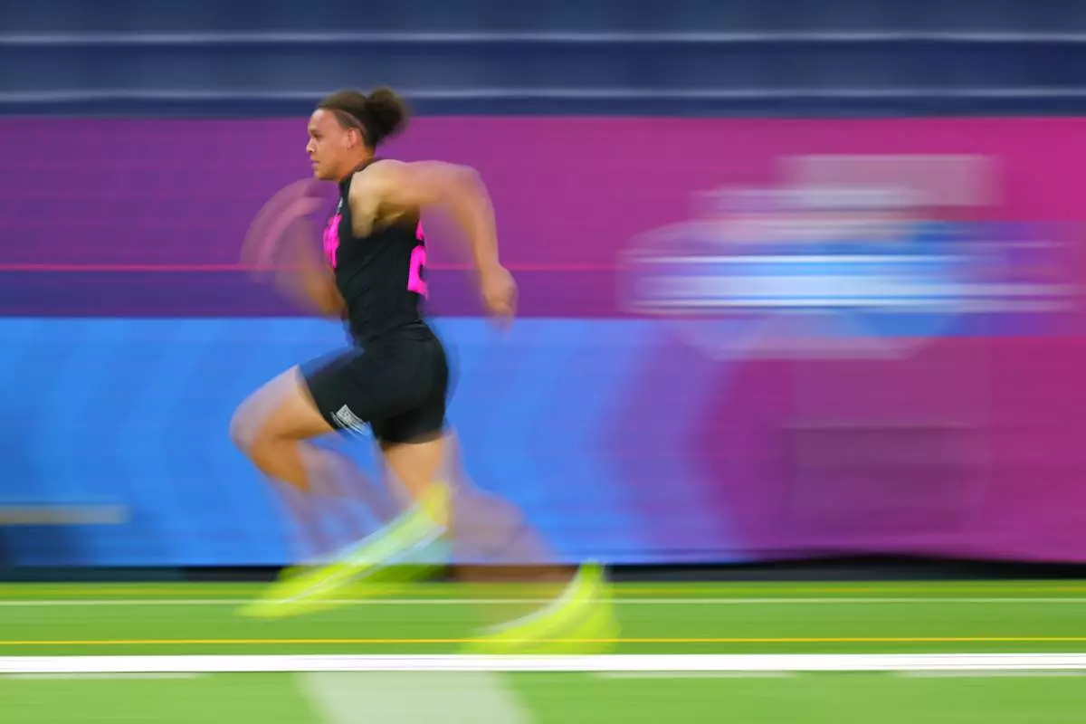 In this photograph taken with a slow shutter speed, Vanderbilt tight end Eli Stowers (25) runs the 40-yard dash at the NFL football scouting combine in Indianapolis, Friday, Feb. 27, 2026. (AP Photo/Julio Cortez)
