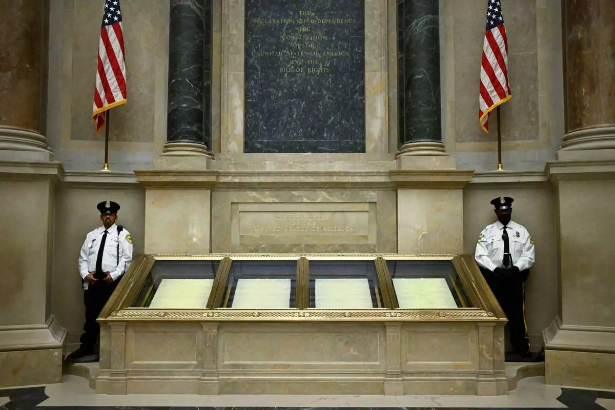 FILE - Two guards stand their posts at the cases containing the United States Constitution at the National Archives Jan. 29, 2026, in Washington. (AP Photo/John McDonnell, File)