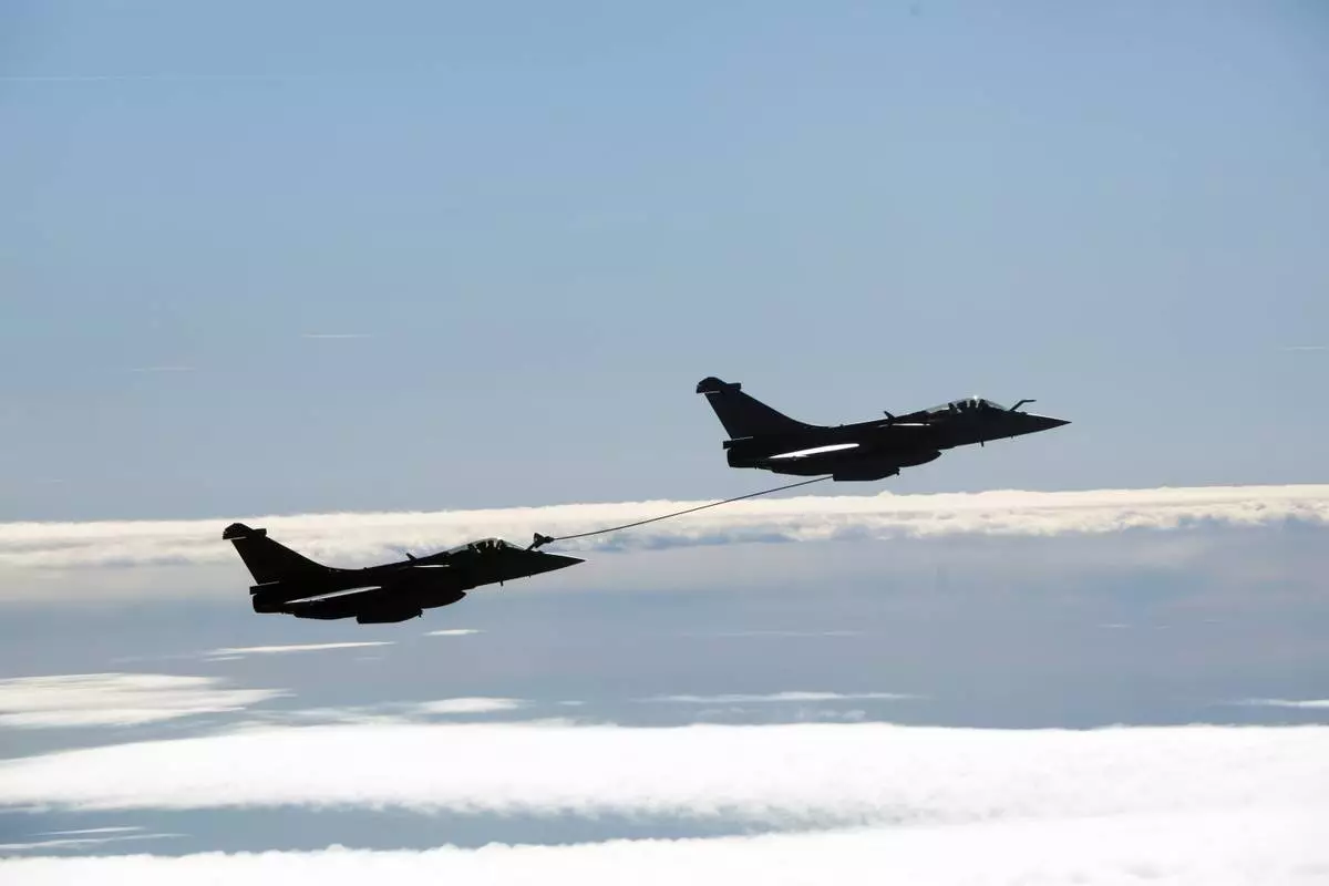 A refueling operation between two Rafale aircraft takes place moments before the arrival of French President Emmanuel Macron at the nuclear submarine navy base of Ile Longue in Crozon, France, Monday March 2, 2026.(Yoan Valat/Pool Photo via AP)