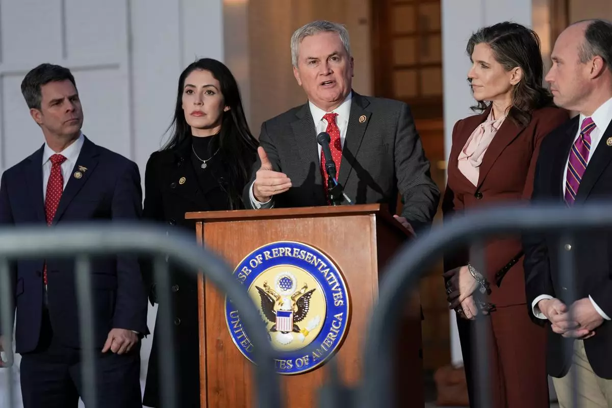 Rep. James Comer, R-Ky., speaks outside the Chappaqua Performing Arts Center where former President Bill Clinton was testifying before U.S. House lawmakers as part of a congressional investigation into convicted sex offender Jeffrey Epstein, Friday, Feb. 27, 2026, in Chappaqua, N.Y. (AP Photo/Angelina Katsanis)