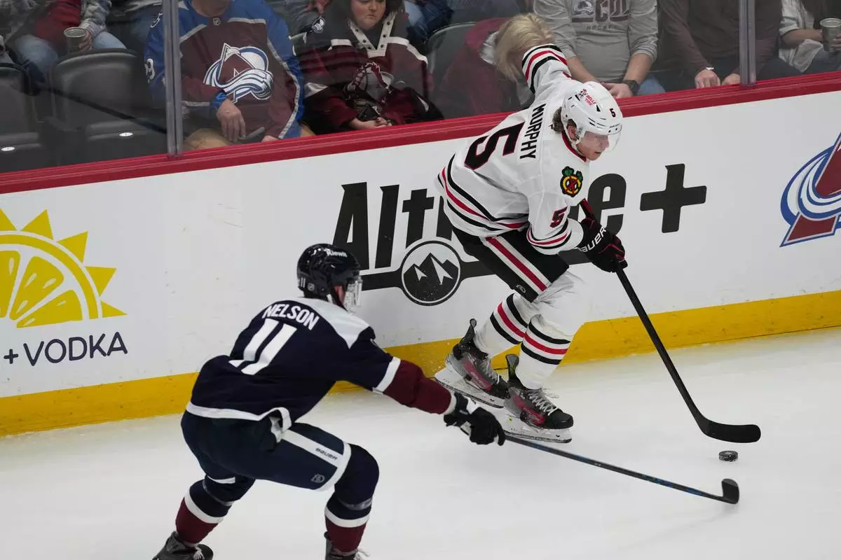 Chicago Blackhawks defenseman Connor Murphy, back, looks to pass the puck as Colorado Avalanche center Brock Nelson defends in the first period of an NHL hockey game Saturday, Feb. 28, 2026, in Denver. (AP Photo/David Zalubowski)