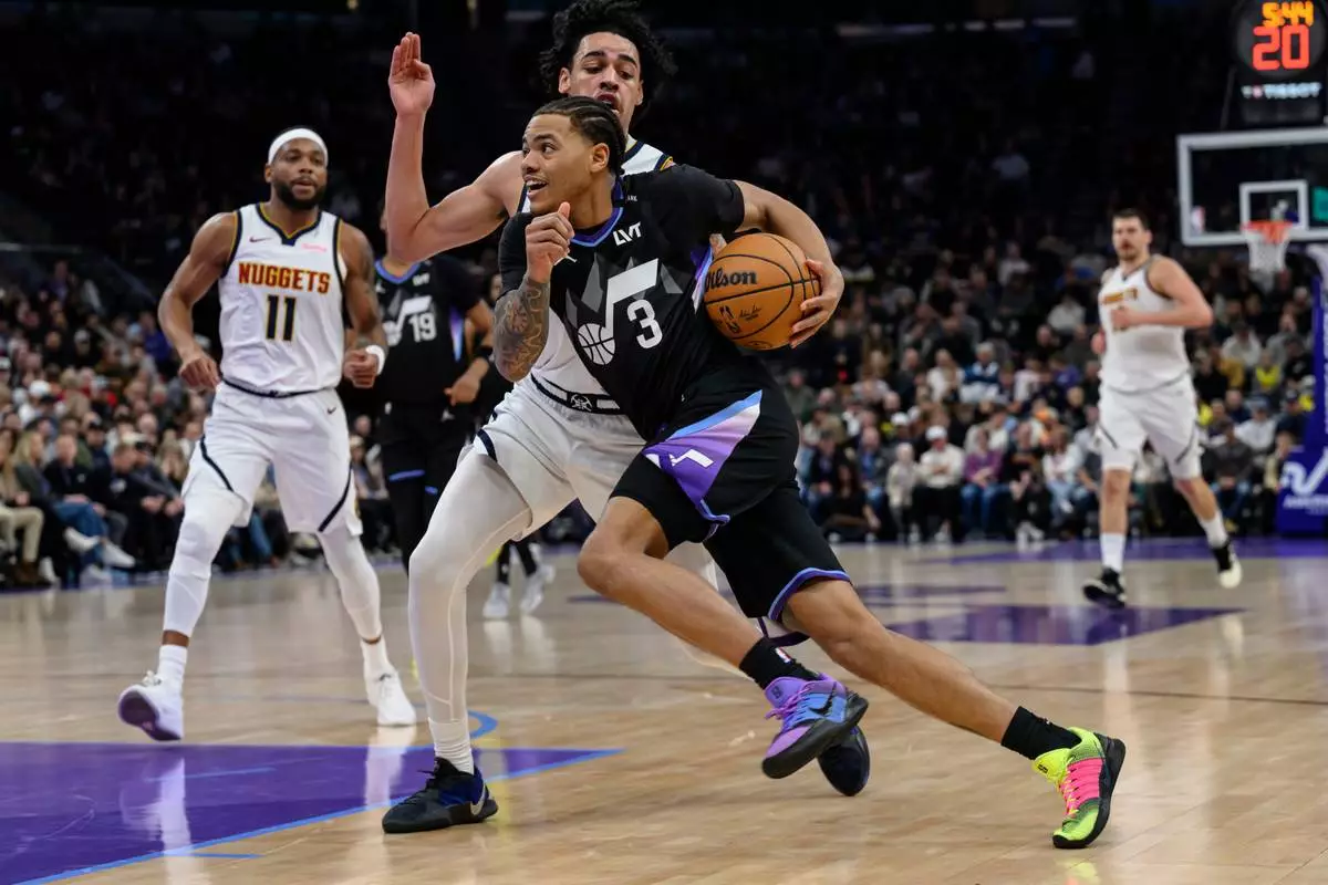 Utah Jazz guard Keyonte George (3) drives to the basket guarded by Denver Nuggets guard Julian Strawther, center back, during the first half of an NBA basketball game, Monday, March 2, 2026, in Salt Lake City. (AP Photo/Tyler Tate)