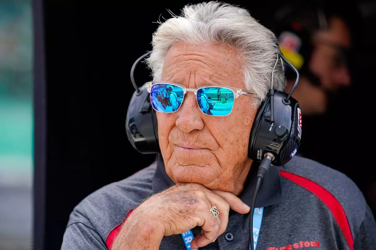 FILE - 1969 Indy 500 champion Mario Andretti watches from his grandson Marco Andretti's pit area during practice for the Indianapolis 500 auto race at Indianapolis Motor Speedway in Indianapolis, May 19, 2023. (AP Photo/Michael Conroy, File)