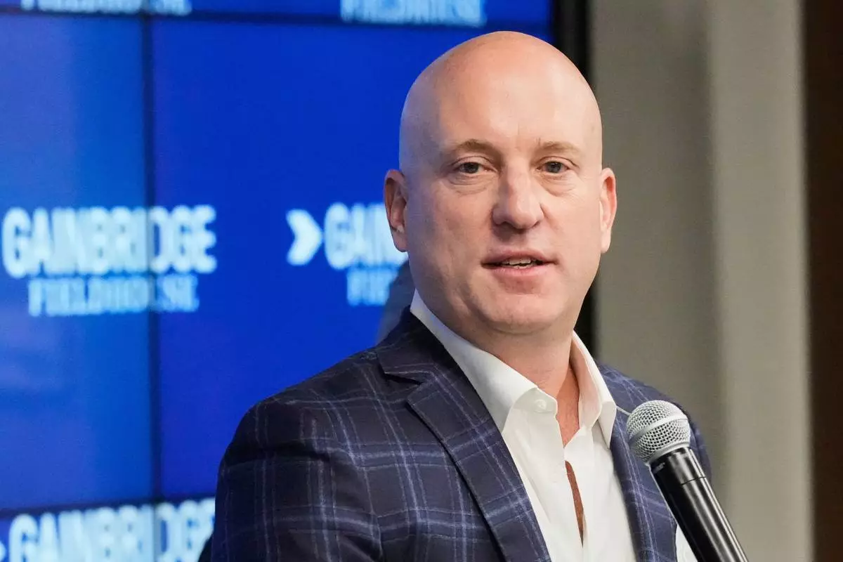 FILE - Group 1001 President & Chief Executive Officer Dan Towriss, also CEO of TWG Motorsports, speaks during a news conference in Indianapolis, Monday, Sept. 27, 2021. (AP Photo/AJ Mast, File)