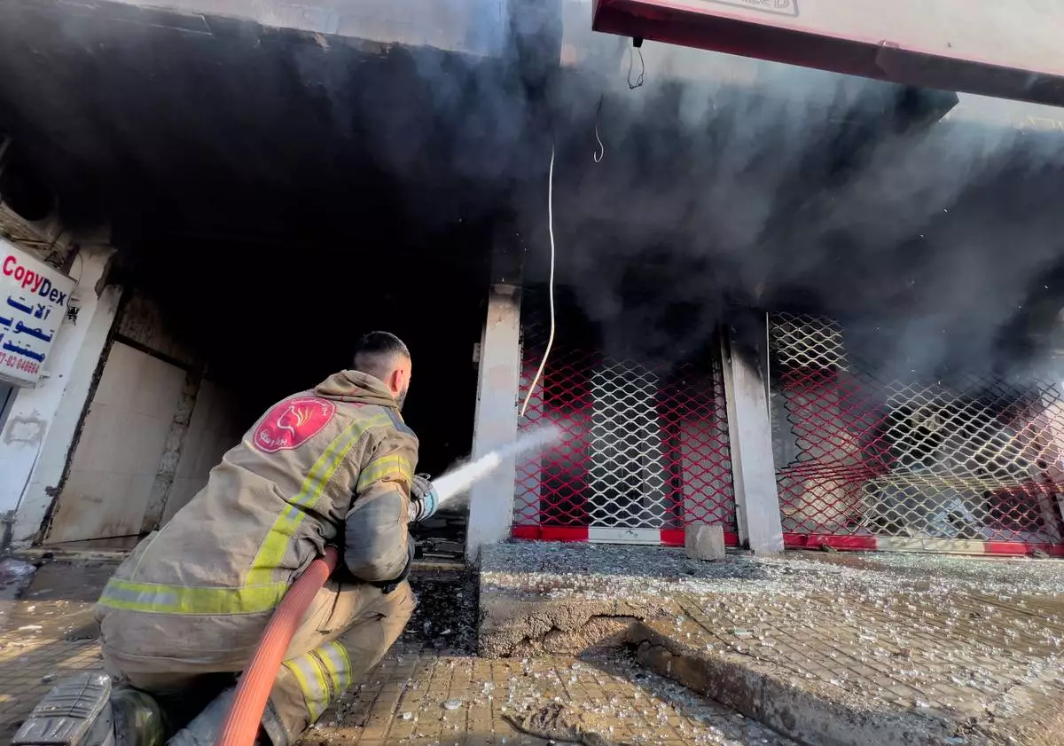 A firefighter extinguishes a burned shop at a building that was hit by an Israeli airstrike in Dahiyeh, a southern suburb of Beirut, Lebanon, Tuesday, March 3, 2026. (AP Photo/Hussein Malla)