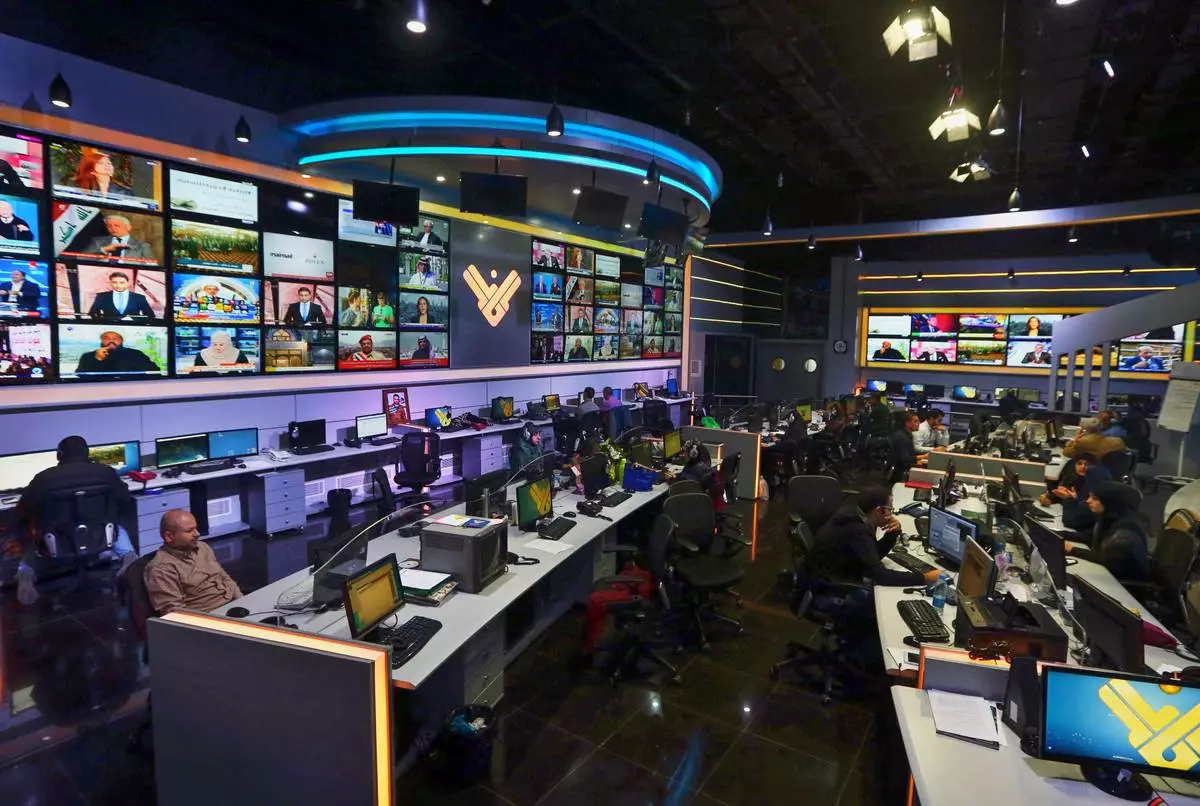 FILE - Employees work in the newsroom of Hezbollah's Al-Manar TV station in Dahiyeh, a southern suburb of Beirut, Lebanon, Thursday, Dec. 10, 2015. (AP Photo/Bilal Hussein, File)