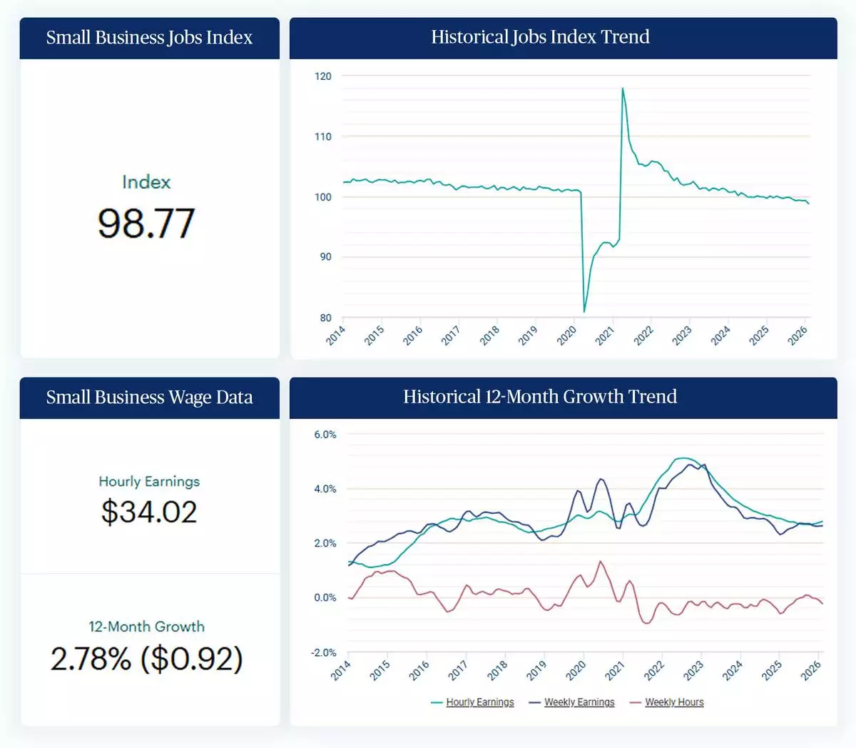 According to the latest Paychex Small Business Employment Watch, the Small Business Jobs Index registered 98.77 in February. Meanwhile, hourly earnings growth among small business workers was 2.78% in February, remaining below three percent for the 16th consecutive month. The Small Business Employment Watch reflects the payroll data of a subset of Paychex U.S. small business clients with fewer than 50 employees.