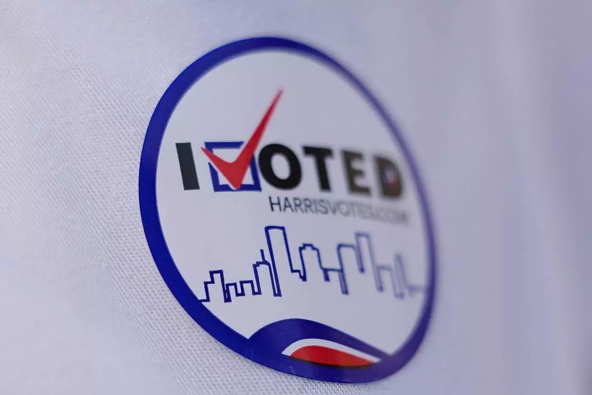A man wears an "I voted" sticker outside a polling location Tuesday, March 3, 2026, in Spring, Texas. (AP Photo/David J. Phillip)