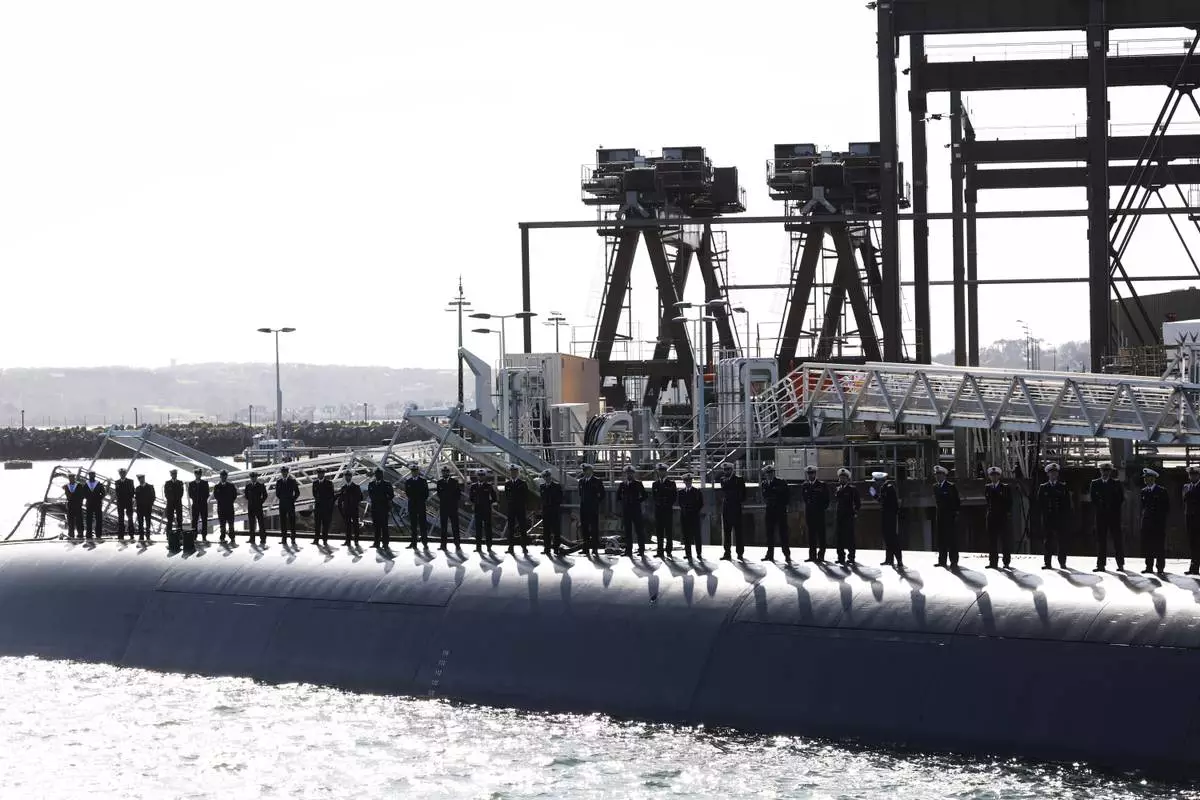 Members of the French Navy are aboard a submarine awaiting the arrival of French President Emmanuel Macron at the nuclear submarine navy base of Ile Longue in Crozon, France, Monday March 2, 2026. (Yoan Valat/Pool Photo via AP)