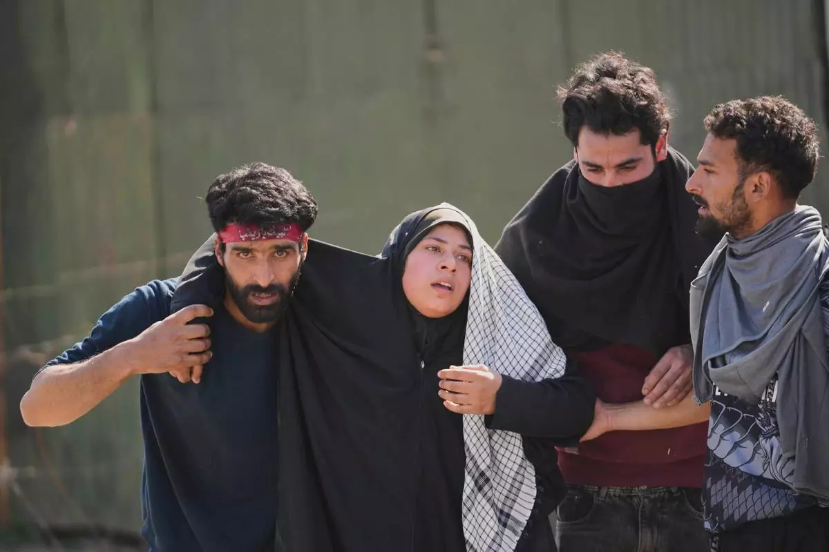 An injured Shiite Muslim woman is taken to medical help during a protest against the killing of Iran's Supreme Leader Ayatollah Ali Khamenei, in Srinagar, Indian controlled Kashmir, Monday, March 2, 2026. (AP Photo/Mukhtar Khan)