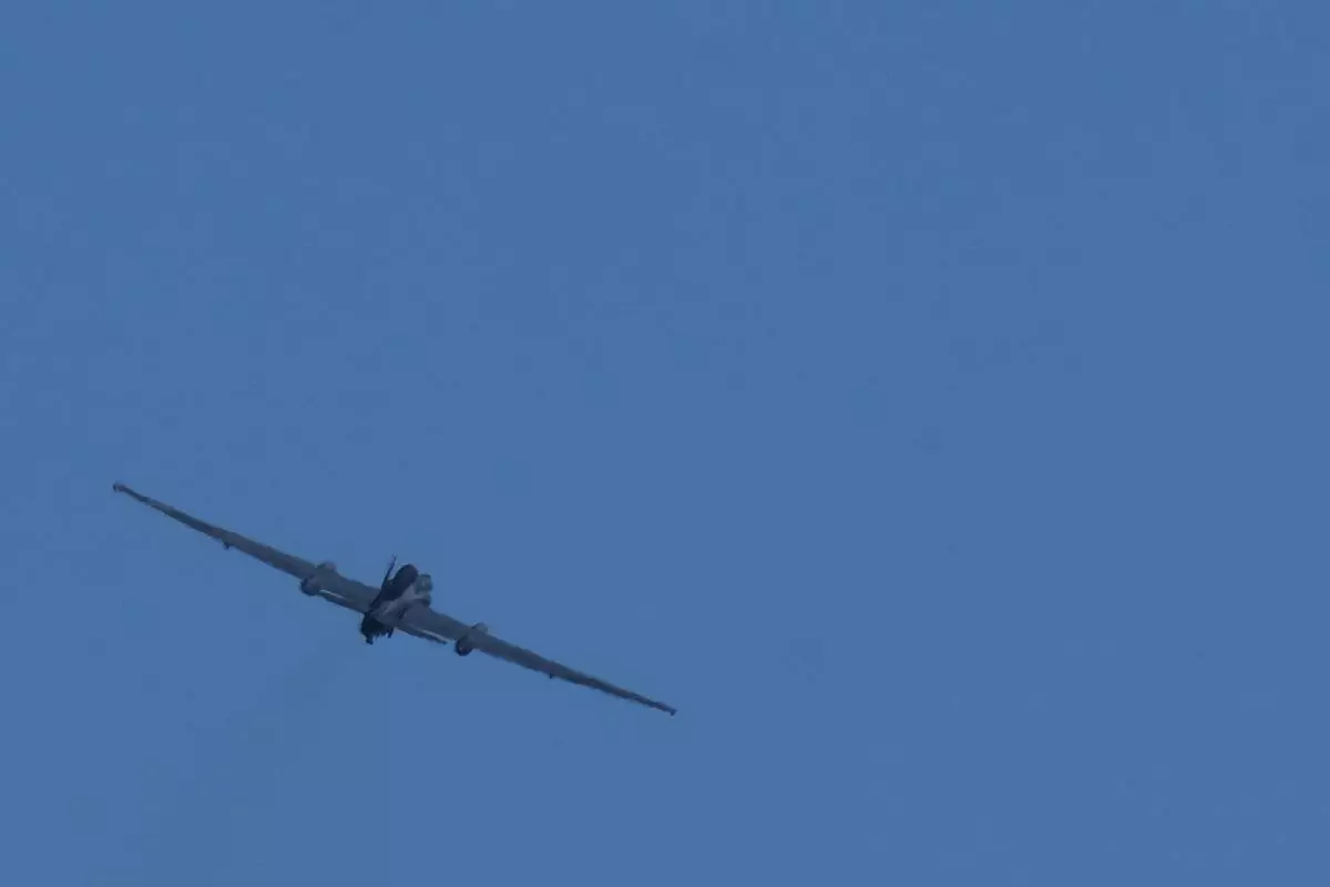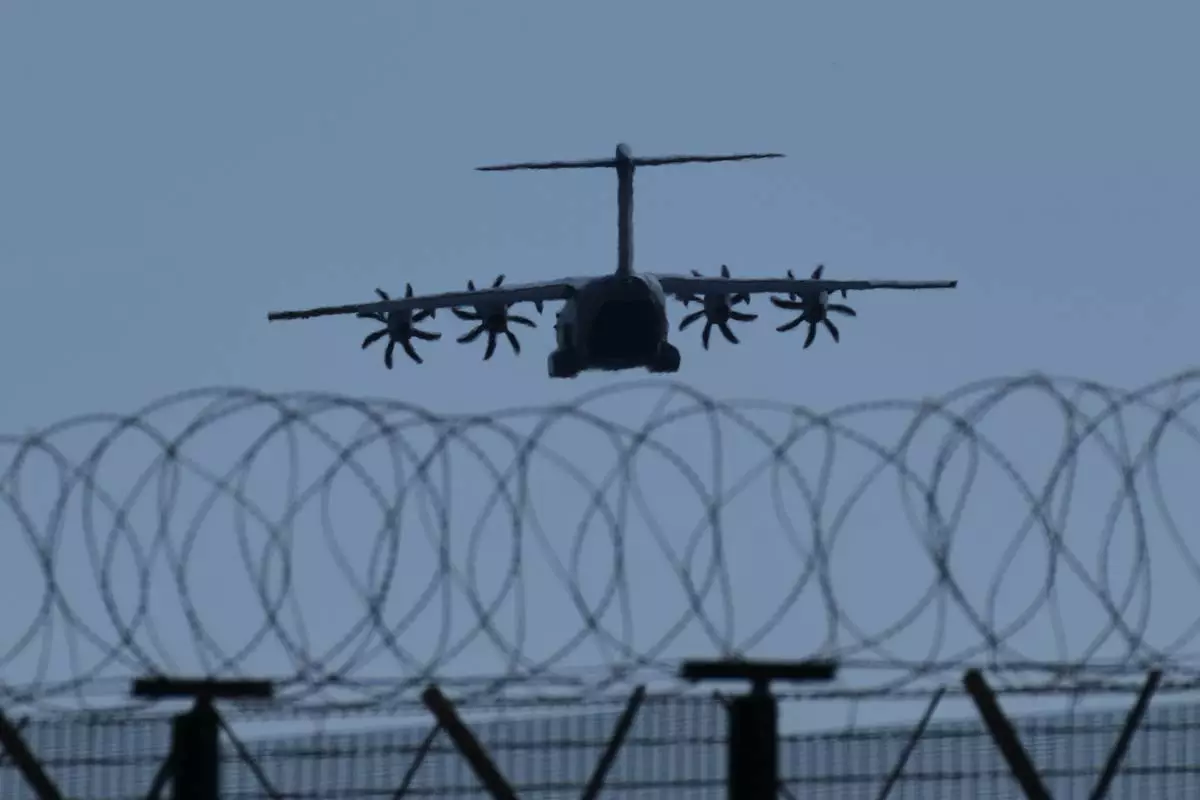 A transport aircraft prepares for landing at U.K.'s RAF Akrotiri air base near Limassol, Cyprus, Tuesday, March, 3, 2026. (AP Photo/Petros Karadjias)