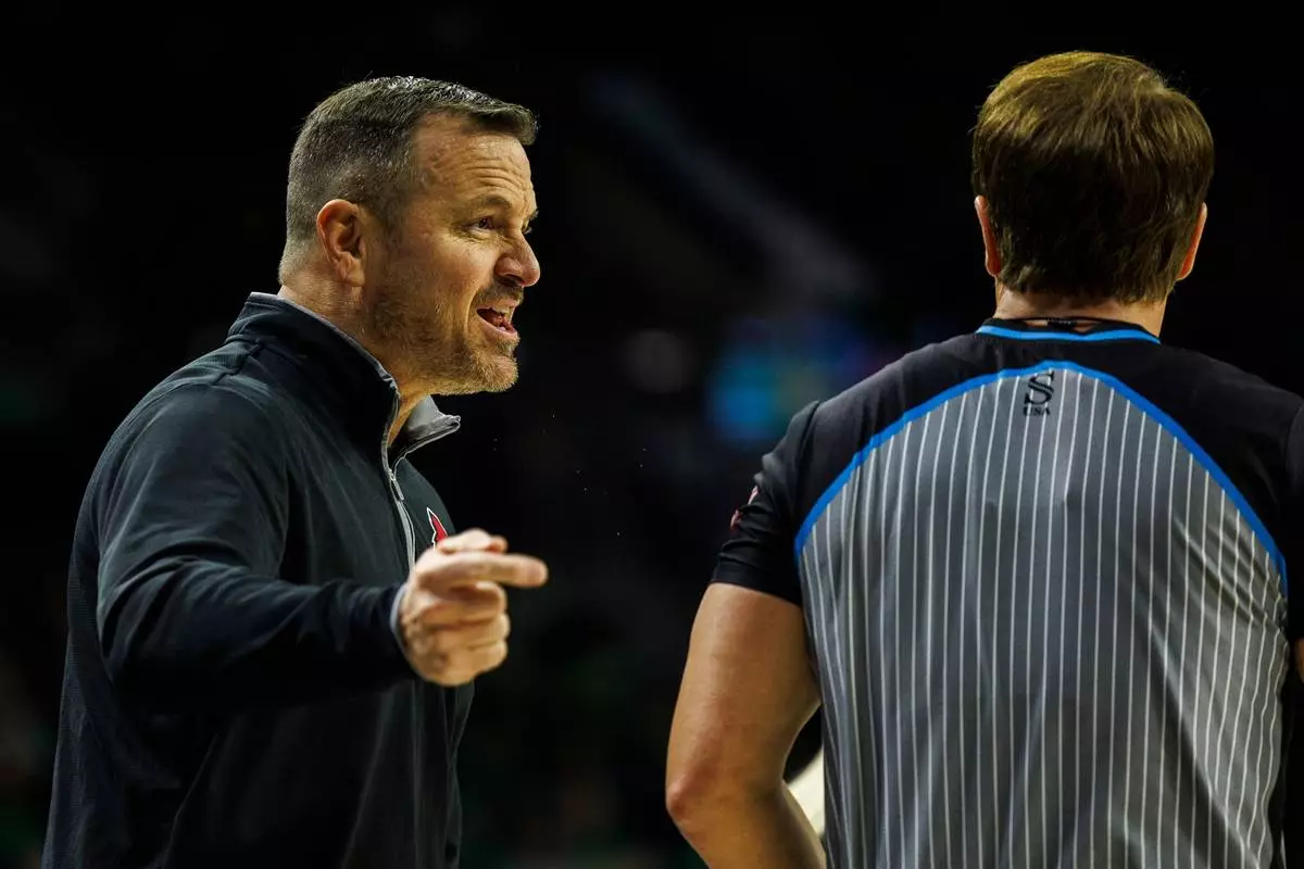 FILE - Louisville head coach Jeff Walz, left, disagrees with a call during the first half of an NCAA college basketball game against Notre Dame, March 2, 2025, in South Bend, Ind. (AP Photo/John Mersits, File)